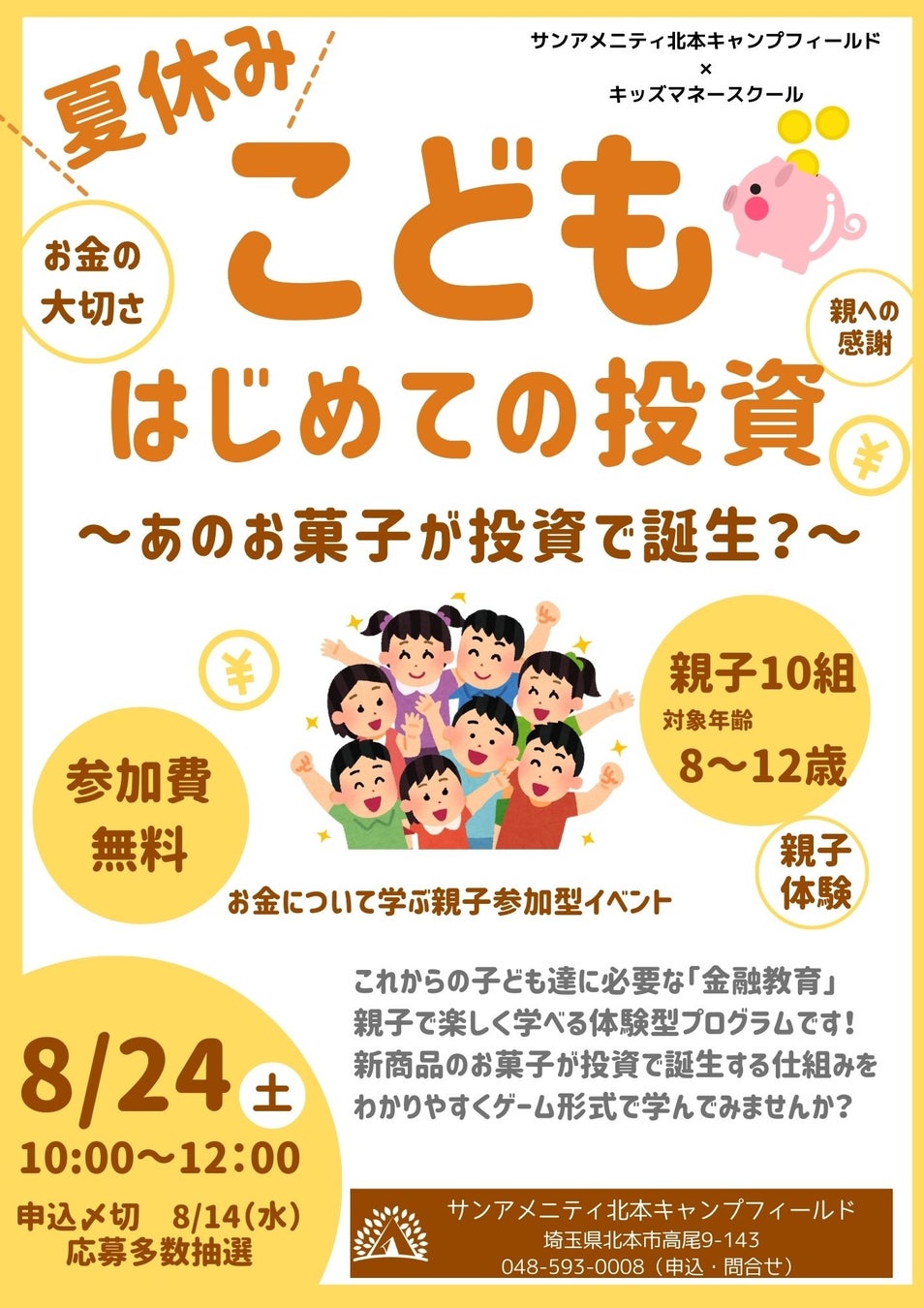 【夏休み無料イベント】8/24(土)親子で学ぶ「こども はじめての投資」を埼玉で開催!サンアメニティ北本キャンプフィールド×キッズマネースクール