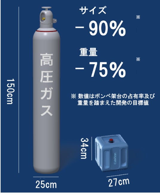 次世代高圧ガス容器CubiTanⓇは、多孔性配位高分子(PCP/MOF)※を使用して、今まで室温下での圧縮が難しかったメタンガスをナノレベルでコントロールが可能なガス容器です。これにより、今まで非常に重く大きいガスボンベの小型化・軽量化というイノベーションが実現します。