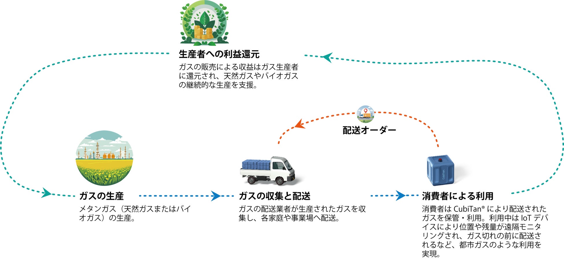 弊社は、2022年からのAtomis社との連携により、世界に新たな持続可能性をもたらす一つの解として、新たなガス流通システム『スマートガスネットワーク』構想を進めています。Atomis社が開発するCubiTanⓇを活用したネットワークを構築することで、輸入エネルギー依存度が高い国において、自国生産が可能なガス資源をパイプラインに依存することなく利用するためのシステムです。これにより、エネルギー課題の解決および経済格差の抑制に資する社会システムを実装します。