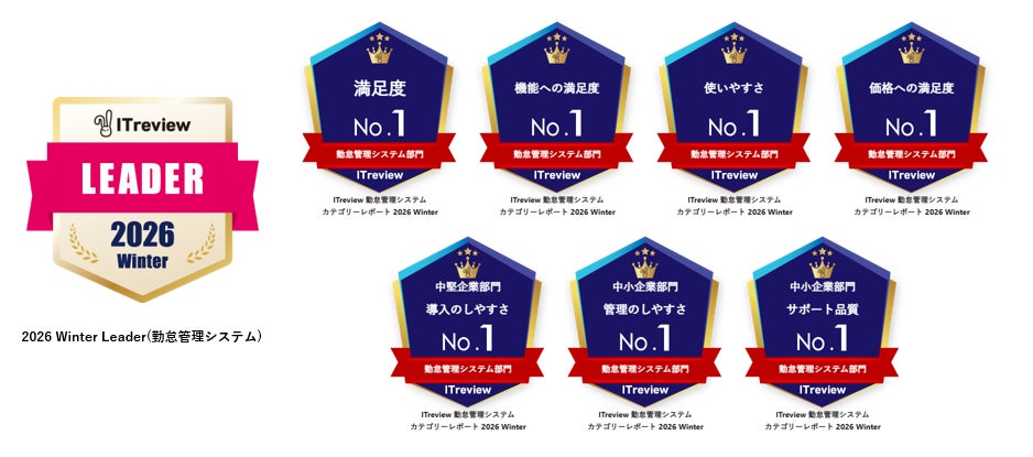 中央システム株式会社(本社:東京都新宿区、代表取締役社長:本間 匡、以下中央システム)クラウド勤怠管理システム「RecoRu(レコル)」がITreview Grid Award 2026 Winterで最高位の「Leader」を7期連続受賞したことをお知らせいたします。また、勤怠管理システム部門において、満足度No.1を獲得したほか、「機能への満足度」「使いやすさ」「価格への満足度」「導入のしやすさ(※中堅企業部門)」「管理のしやすさ(※中小企業部門)」「サポート品質(※中小企業部門)」でもNo.1を獲得しています。