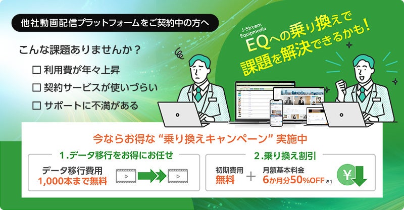 株式会社Jストリーム(東証グロース:4308 代表取締役社長:石松 俊雄、以下Jストリーム)は、2024年10月1日から2025年3月31日までの期間、ご利用中の動画配信プラットフォームから、当社の法人向け動画共有・配信プラットフォーム「J-Stream Equipmedia(EQ)」に乗り換えいただいたお客様向けのキャンペーンを実施いたします。本キャンペーンの適用により、①利用中サービスからのデータ移行費用無料、②初期費用無料、③初年度の月額基本料金6か月分が半額 となります。