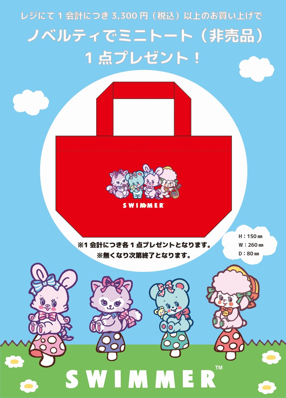 さらに、SWIMMER商品を3,300円(税込)以上ご購入いただいたお客様には非売品ミニトート1点のプレゼントもございます!(ノベルティはなくなり次第終了)