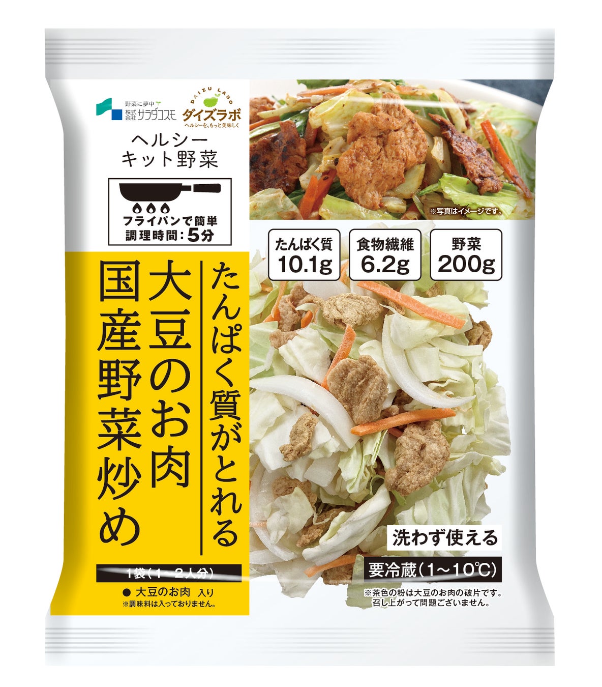 大豆のお肉とカット野菜が一袋に、フライパンで5分炒めるだけのヘルシーな一品