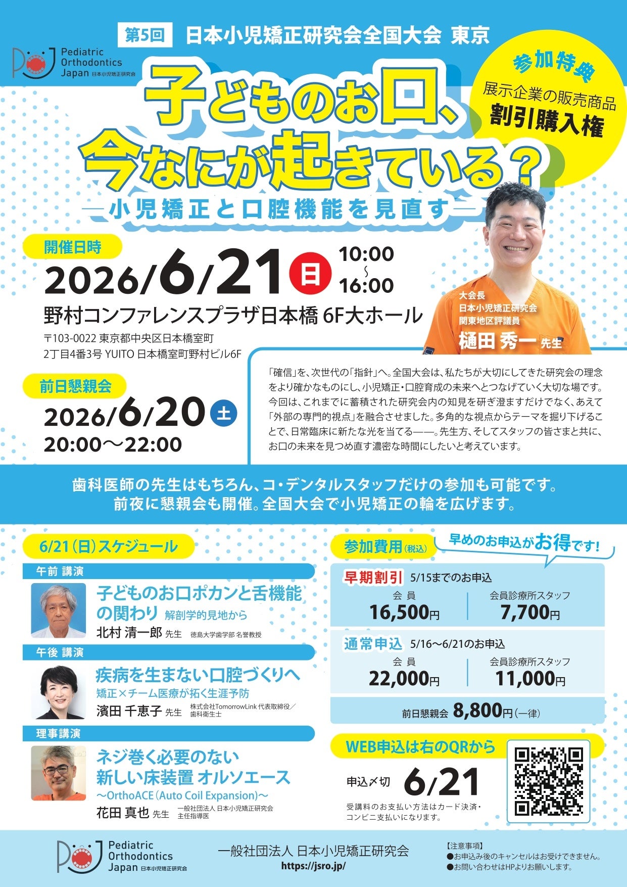 本全国大会は、研究会会員および会員診療所スタッフを対象とした会員限定の学術大会であり、小児矯正と口腔機能育成をテーマに全国の歯科医師・歯科衛生士が一堂に会します。臨床現場に直結する最新の知見を共有するとともに、実践的な議論を深める場となります。