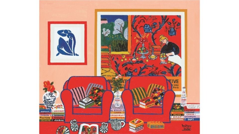 鮮やかな赤の色彩と、モダンなデザインで描かれる油彩画。キャンバスのいたるところには、可愛らしい花やアートブックなど、作家自身のお気に入りのアイテムがちりばめられ、見る人を優しく励ましてくれます。