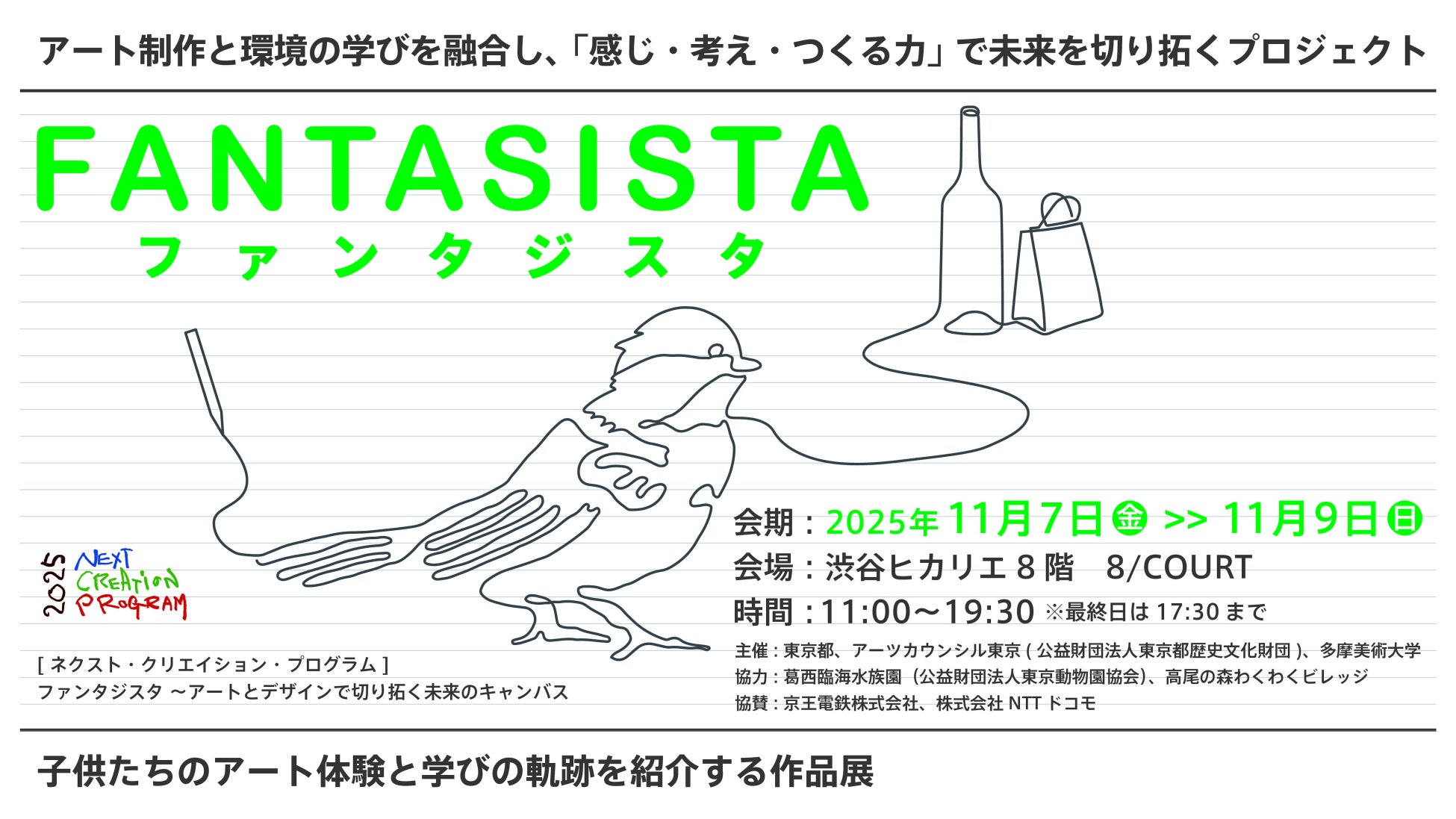 東京都・アーツカウンシル東京・多摩美術大学が主催するネクスト・クリエイション・プログラム「ファンタジスタ~アートとデザインで切り拓く未来のキャンバス~」は、アート作品制作を通してアート教育と環境教育を融合し、未来をつくる「創造する力」を育むプログラムです。アートにある「正解のない課題に挑む力」と、環境教育にある「大きな課題に粘り強く向き合う力」。その二つを結び合わせ、柔軟な思考と前向きに進む意志を育ててきました。本展示では多摩美大生も伴走した子供たちの芸術文化体験と学びの軌跡をご紹介します。アートが未来の感性を育む現場をご覧ください。