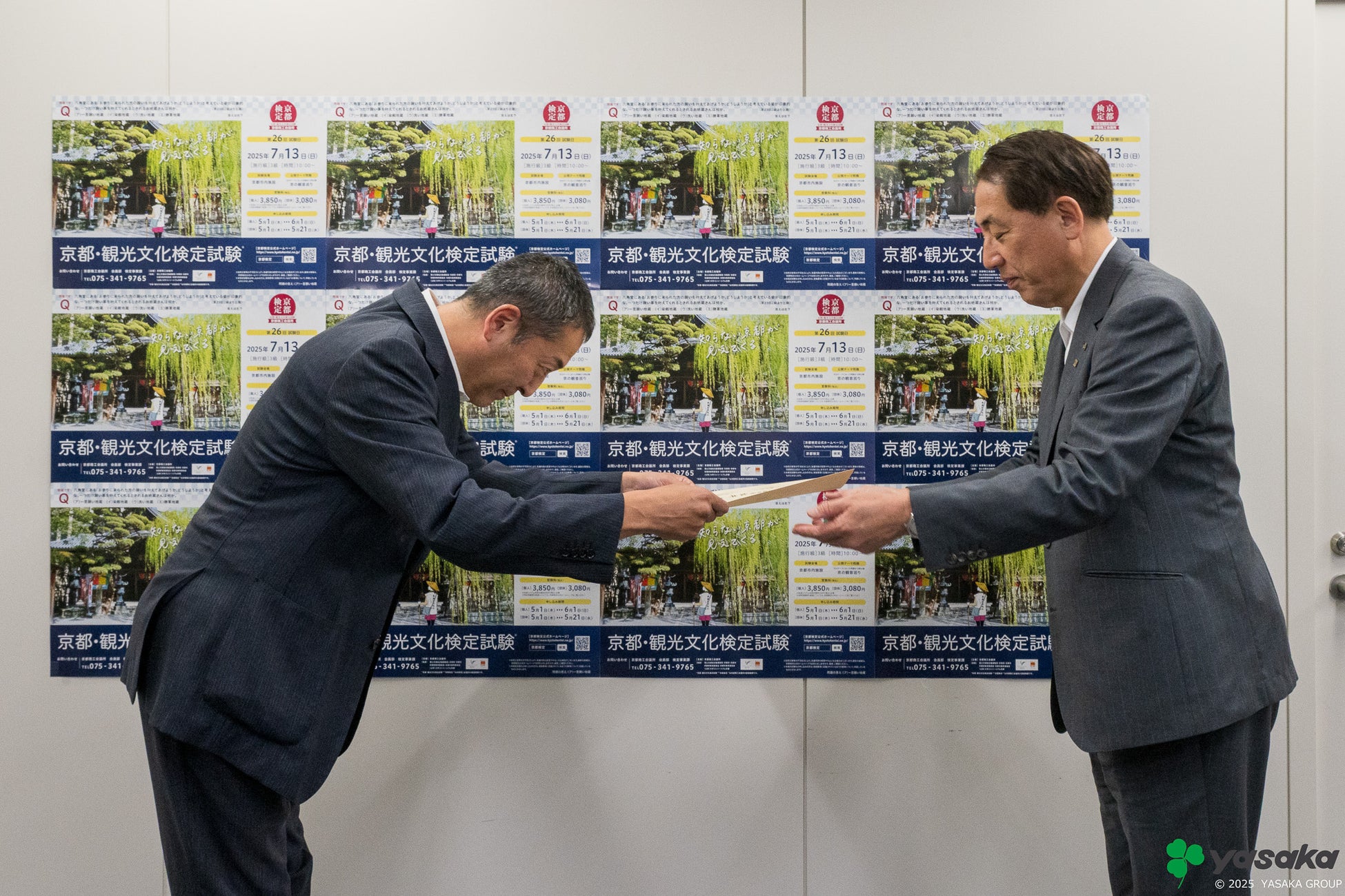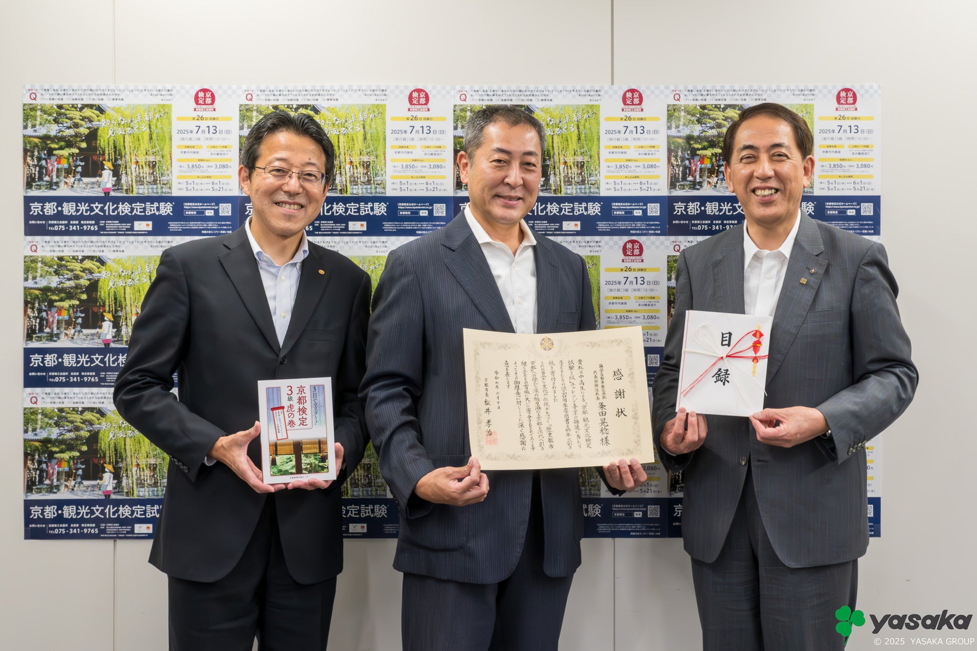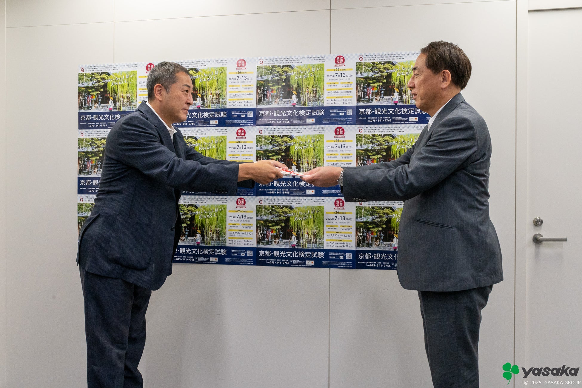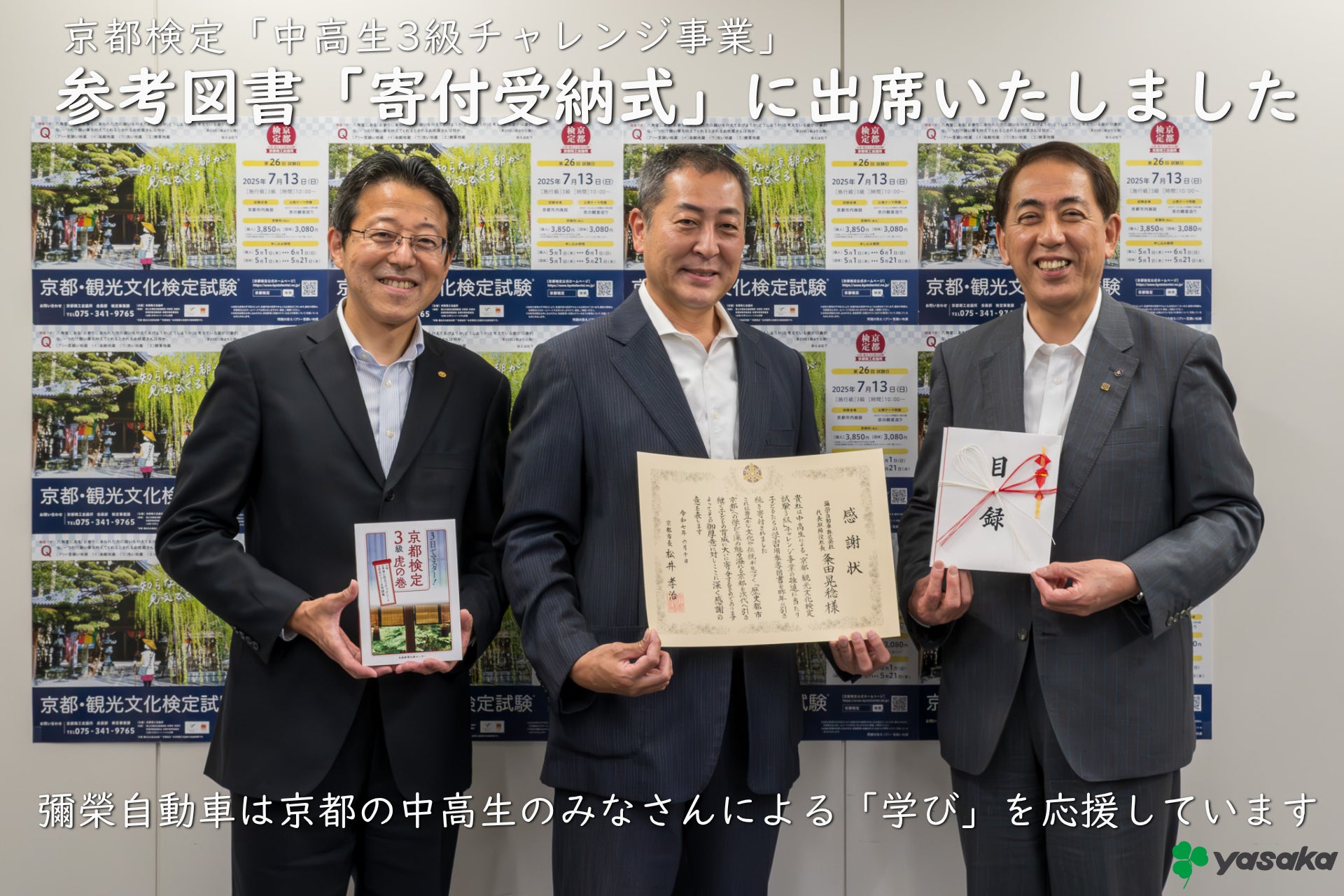 2015(平成27)年から彌榮自動車は、京都市と京都商工会議所が連携して取り組まれている京都検定「中高生3級チャレンジ事業」を応援するため、京都検定を受験する京都の中高生のみなさんに参考図書として『京都検定 3級虎の巻(京都新聞出版センター)』1,000冊の寄付を行っています。この取り組みは本年で11年目となります。本年は受納式を2025(令和7)年6月10日に京都市教育委員会にて開催いただきました。