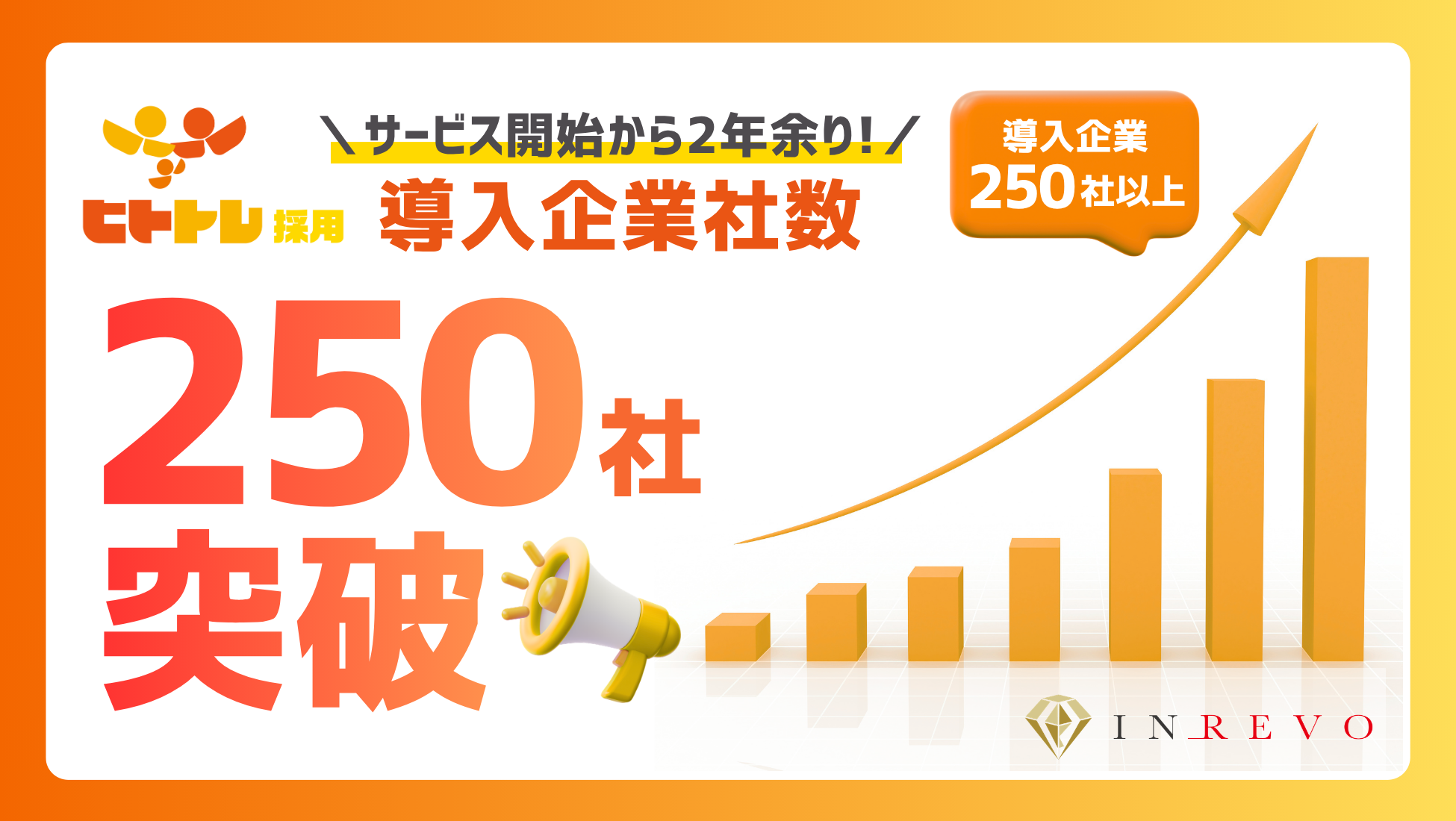 株式会社INREVO(本社:福岡県福岡市博多区、代表取締役:南 晴仁)は、2026年2月、当社が提供する採用プロセス全体を伴走支援するRPO(採用代行)サービス「ヒトトレ採用」の導入企業数が累計250社を突破したことをお知らせいたします。