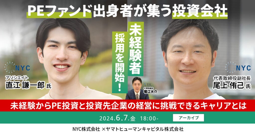 【6/7開催アーカイブ】PEファンド出身者が集う投資会社が未経験者採用を開始!未経験からPE投資と投資先企業の経営に挑戦できるキャリアとは?