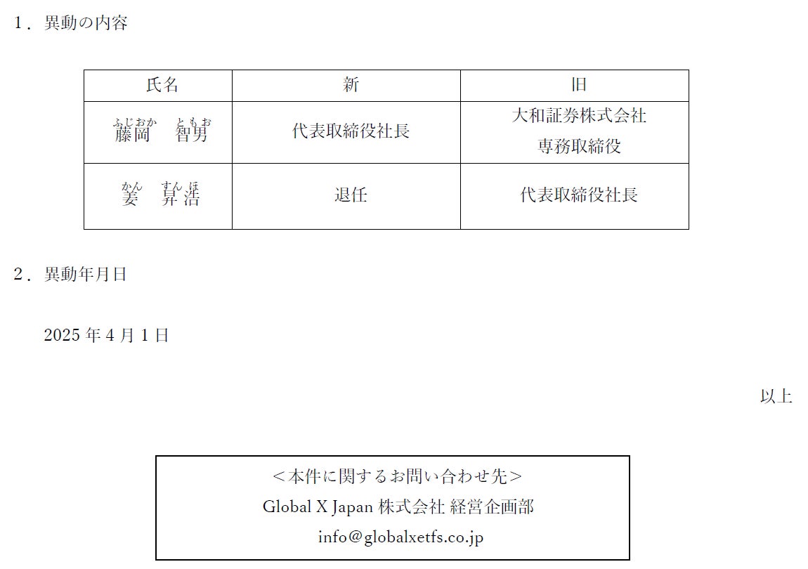 Global X Japan株式会社は、本日の取締役会において、下記の通り代表取締役社長の異動を決定しましたので、お知らせします。