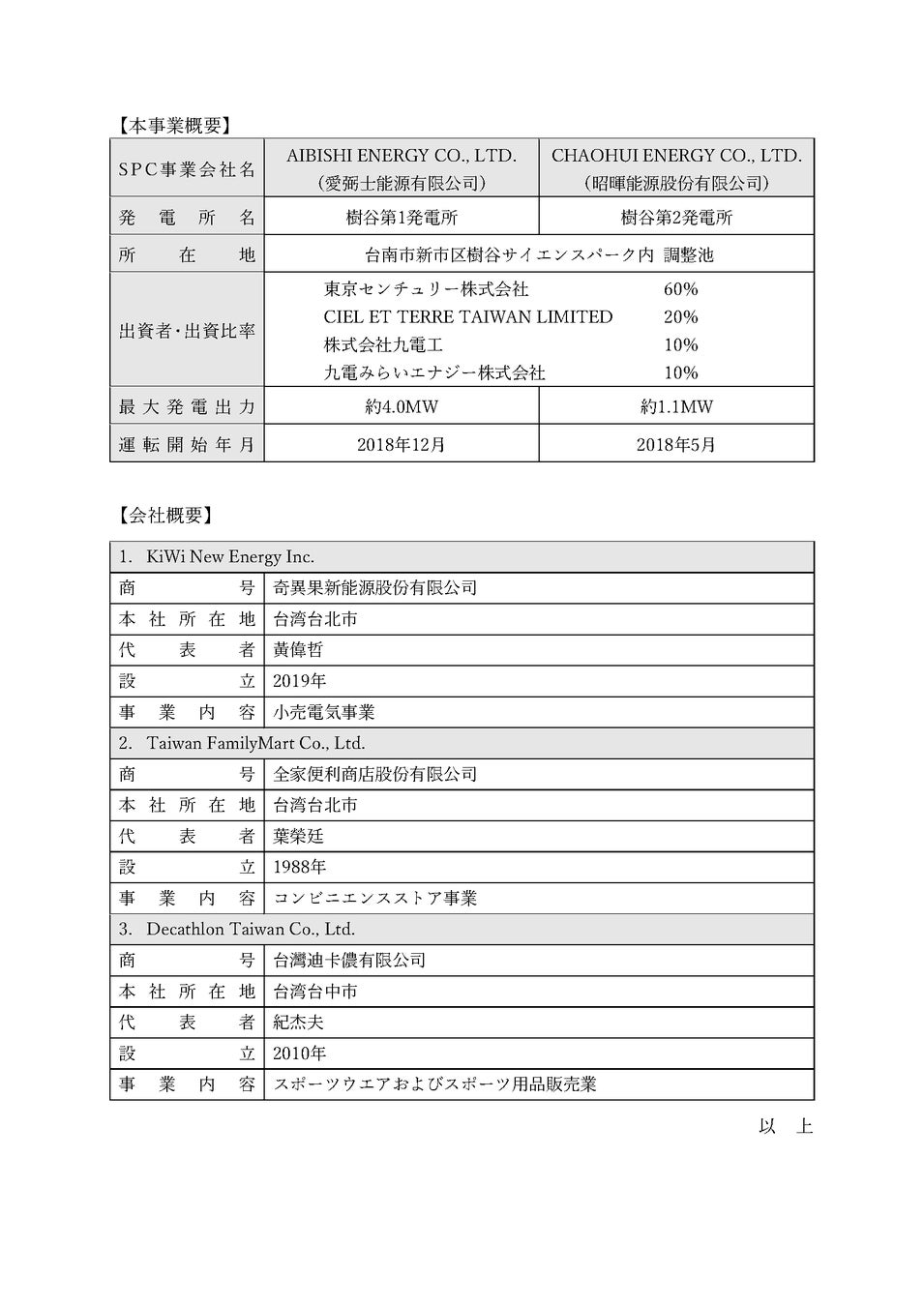 KiWiは、革新的なAIグリーン電力取引プラットフォーム技術に注力し、持続可能なエネルギーソリューションを提供する企業です。本PPAを通じて、環境への影響を軽減し、エネルギーコストを最適化することを目指しています。加えて、最終需要家であるTaiwan FamilyMart Co., Ltd. (本社:台湾、漢字表記:全家便利商店股份有限公司)およびDecathlon Taiwan Co., Ltd. (本社:台湾、漢字表記:台灣迪卡儂有限公司)に対して、本事業由来の再生可能エネルギーの供給を予定しています。