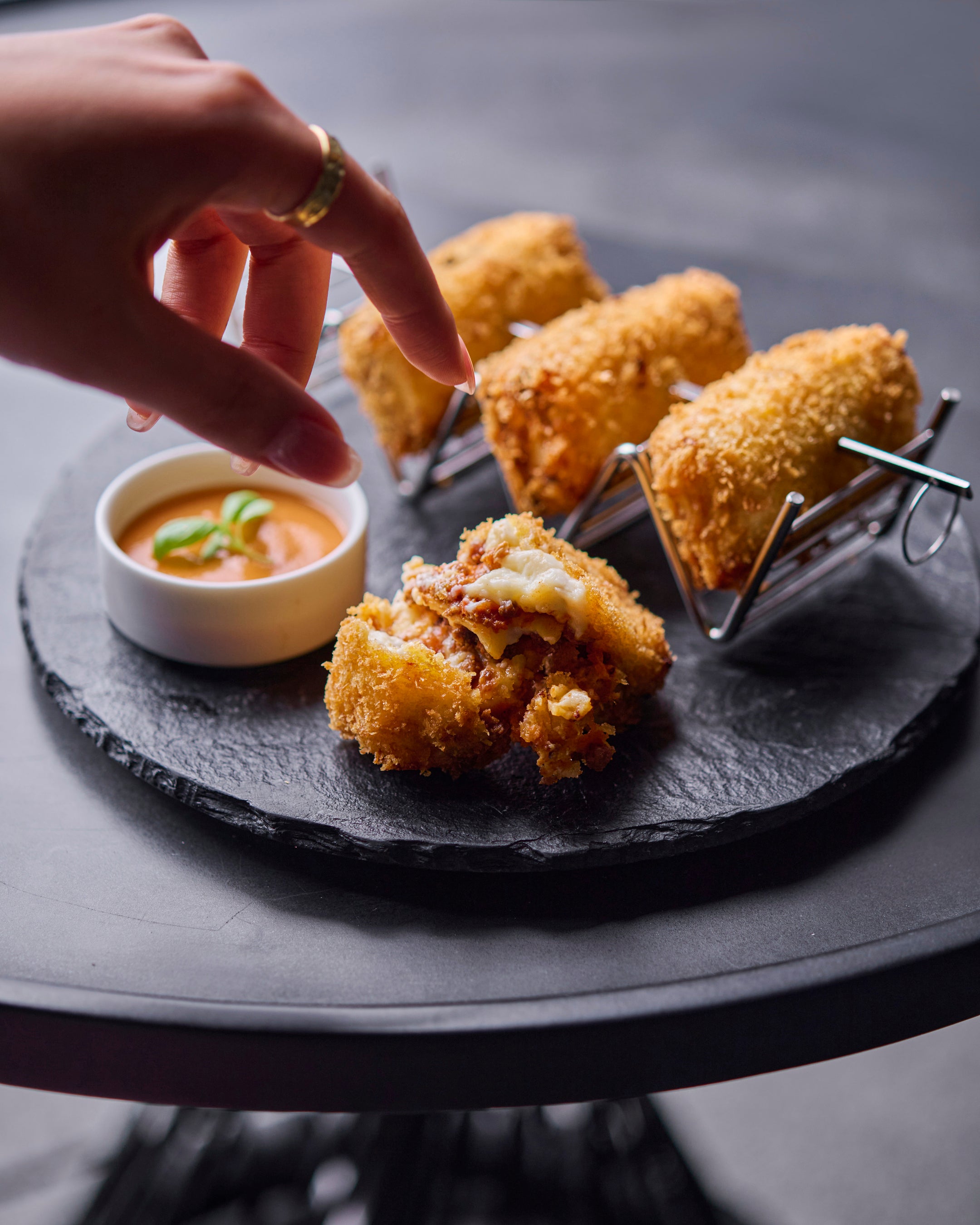 サクッと揚げたリゾットの中にモッツァレラがとろり。バジルと紫蘇のペスト、トマトコンカッセが織りなす香り豊かな一品。