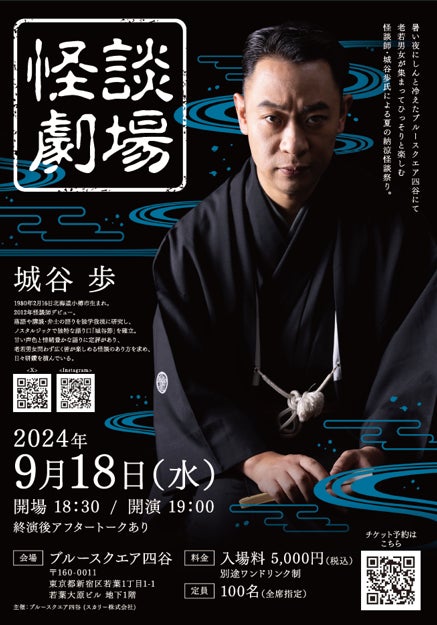 スカリー株式会社が運営するイベントスペース・小劇場「ブルースクエア四谷」は2024年9月18日(水)に大人気怪談師の城谷歩氏を迎え、初の怪談イベント『怪談劇場』を開催いたします。