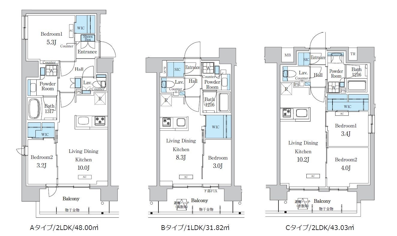 面積帯:31.82㎡~48.00㎡(全タイプ:メーターボックスを含む/Cタイプ:トランクルームを含む)