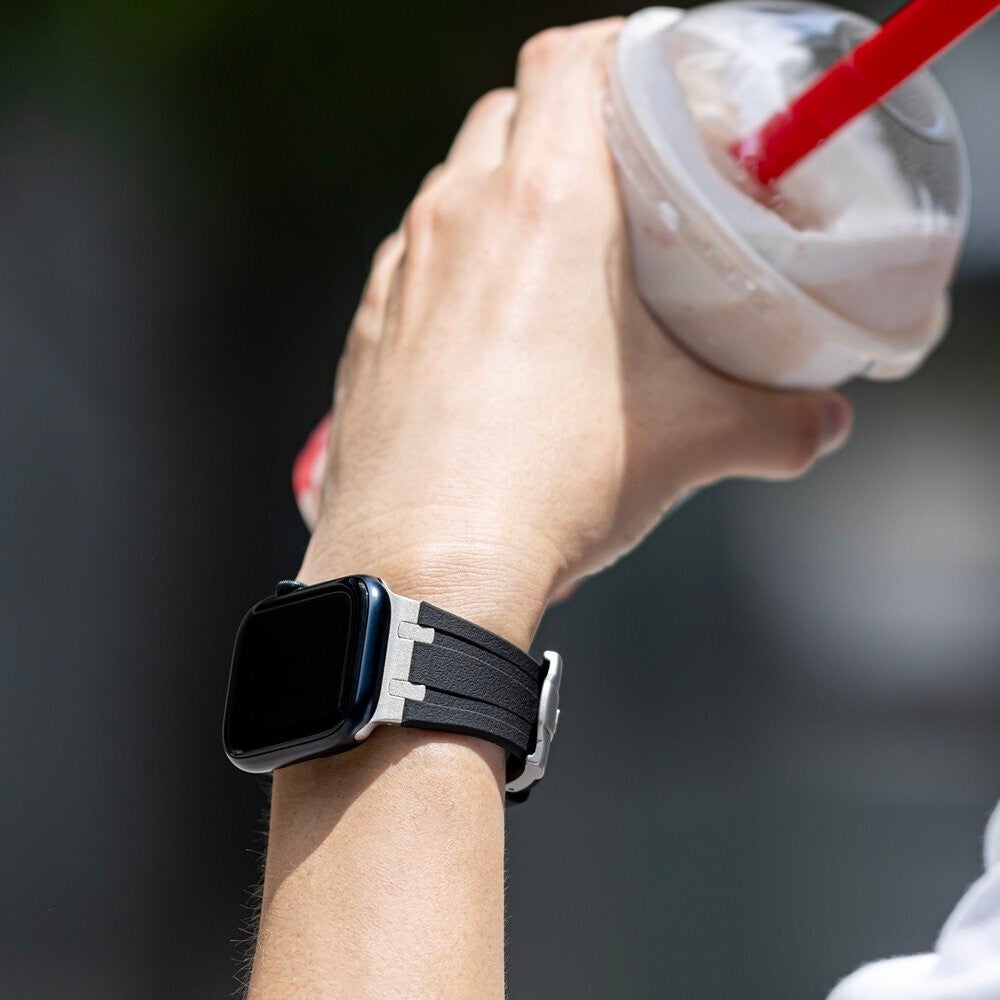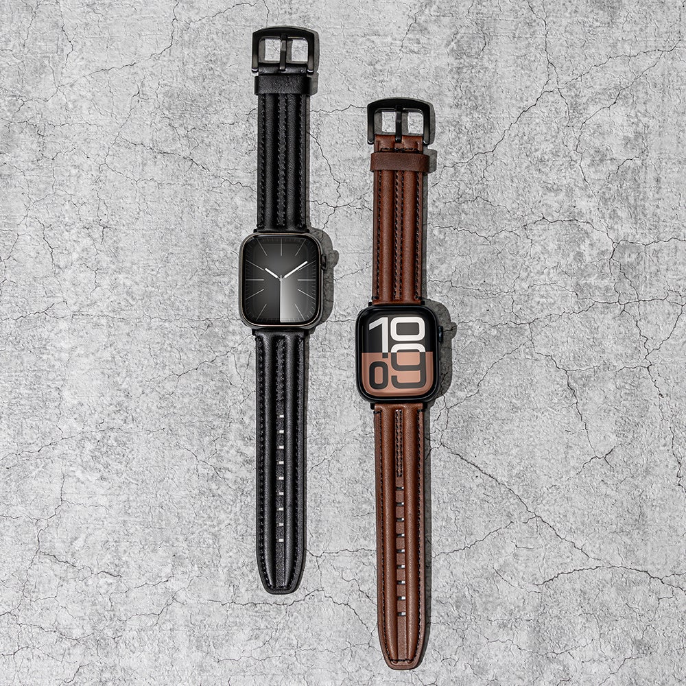タイムレスに使えるスマートなレザーバンドです。アクセントとなるステッチにはハイエンドミシンを使用し、美しさだけでなく、しなやかさも兼ね備えています。