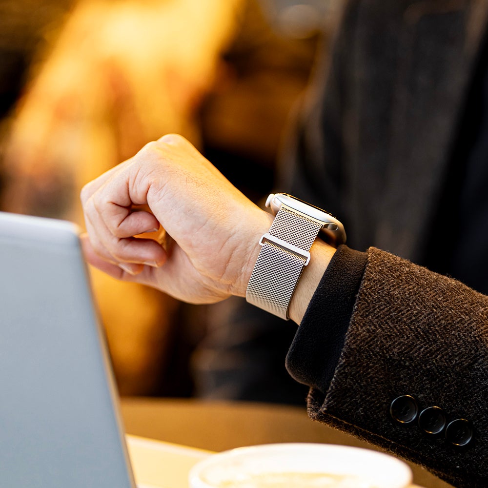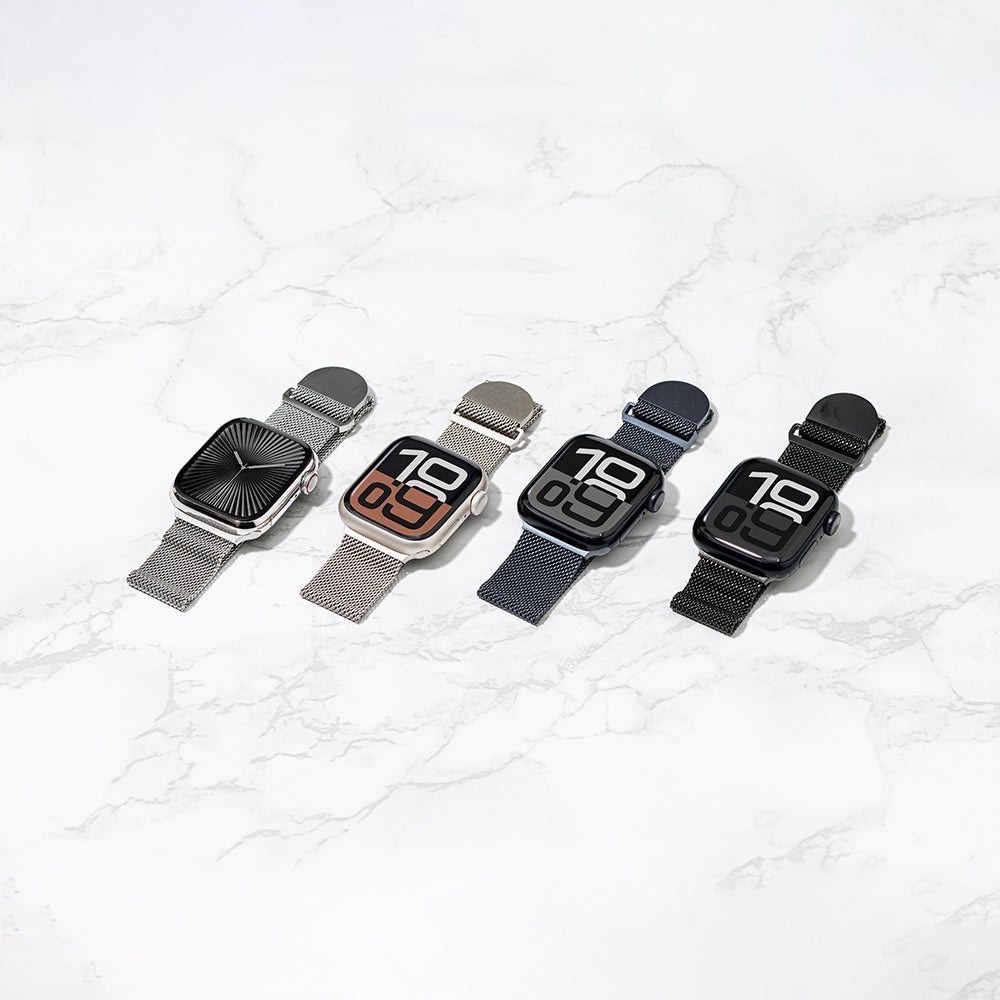 誰もが使いやすいマグネットで着脱するループバンド。軽量のステンレスメッシュ素材で長時間の着用でも快適です。マグネットバックルは自由にサイズ調整ができ、手首にしっかりフィットします。