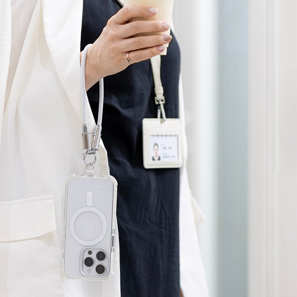 カジュアルになりがちなラウンドロープ(丸紐)ストラップに、オニキスやパープルキャッツアイの宝石を組み合わせ、他にはないエレガントさをプラス。付属のチェーンストラップは、ハンドストラップやブレスレットとしてもお使いいただけます。