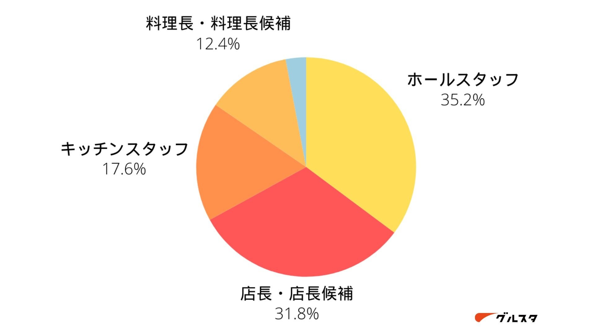 今回の調査では、飲食業界で正社員を目指す求職者の希望職種について、ホールスタッフが全体の35.2%を占め、最も高い割合を示しました。次いで、店長・店長候補が31.8%、キッチンスタッフが17.6%、料理長・料理長候補が12.4%となり、求職者の多くがホールスタッフや店長・店長候補といった職種を希望していることが明らかになりました。