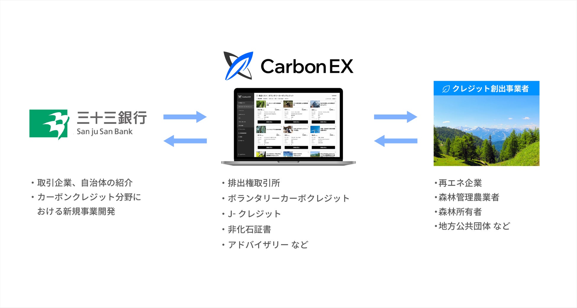 カーボンクレジット取引プラットフォーム「Carbon EX」を運営するCarbon EX株式会社(本社:東京都港区、代表取締役: 西和田浩平、竹田 峻輔、以下「当社」)は、株式会社三十三銀行(本社:三重県四日市市、取締役頭取:道廣 剛太郎、以下「三十三銀行」)と業務提携をいたしました。両社は、カーボンクレジット・排出権取引所「Carbon EX」を活用したカーボンクレジットの活用、活性化に加え、創出に向けた取り組みを推進し、三重県内に所在する企業の脱炭素経営と地域における新たな環境価値創造を支援していきます。