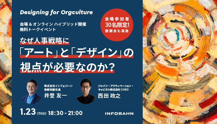 株式会社インフォバーン(TNLメディアジーン グループ企業、以下インフォバーン)は、2025年1月23日(木)に、ジャパン・アクティベーション・キャピタル株式会社CHRO(チーフ・ヒューマン・リソース・オフィサー)の西田政之さんをゲストにお招きし、インフォバーン副社長の井登友一との対談イベントを開催いたします。