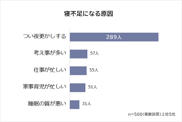 お仕事をしている500人に「寝不足になる原因」を聞いたところ、1位は「つい夜更かしする(289人)」で、全体の6割近くを占めました。2位「考え事が多い(57人)」、3位「仕事が忙しい(55人)」、4位「家事育児が忙しい(51人)」が続きます。