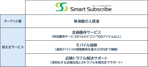 「Smart Subscribe」は、生活に関する各種サービスを“特別優待価格”でご利用いただける「会員優待」に加え、スマートフォン・タブレット・デスクトップPC・ノートPC・モバイルルーター・ゲーム機の修理費用を会員様が自己負担された場合に最大5万円を補償する「通信デバイス修理費用保険」が自動付帯されたサービスです。
