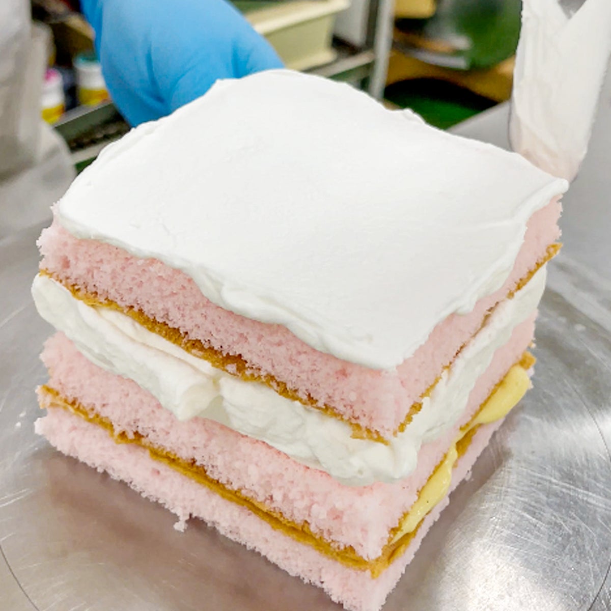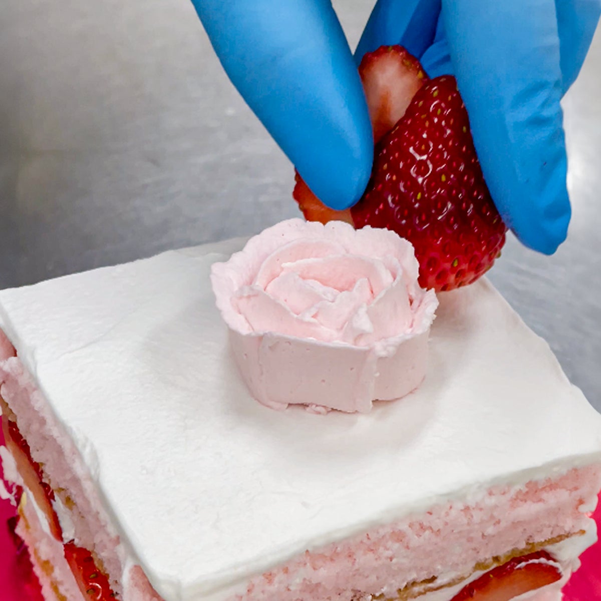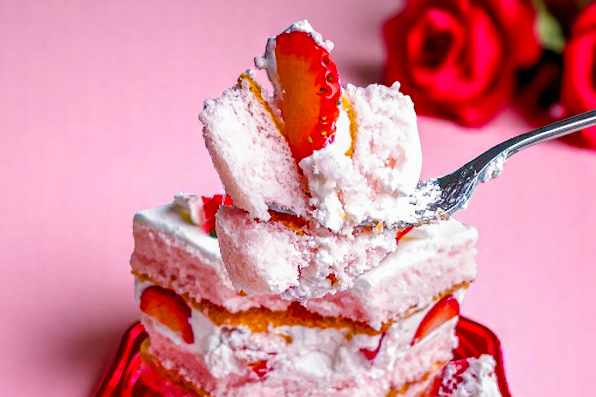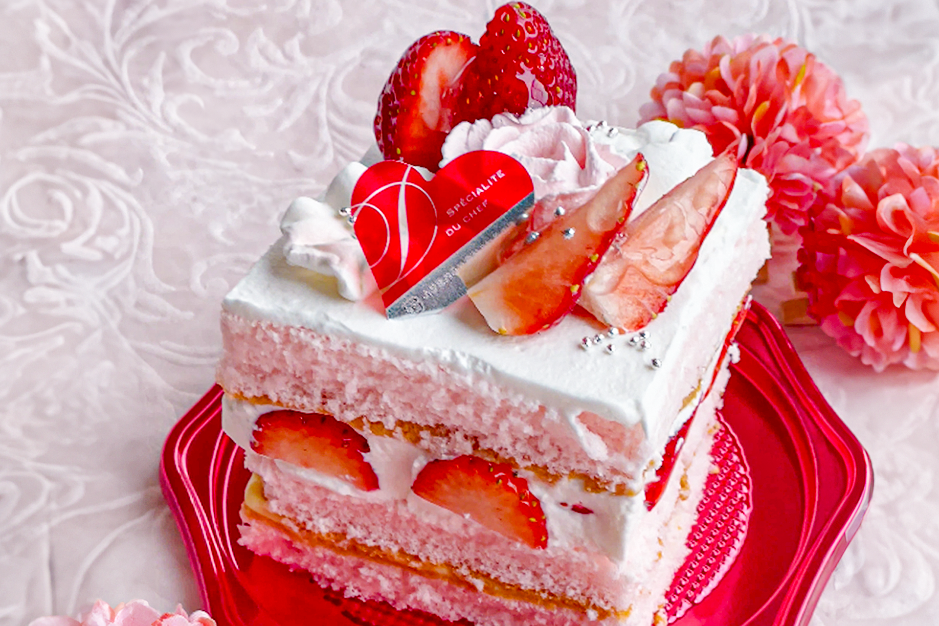 ピンクのスポンジには、苺の濃縮エキスを加えた特製シロップをたっぷり染み込ませ、しっとりふわふわの食感に仕上げました。ひと口頬張れば、ふわっと広がる苺の香りに、思わずうっとり。