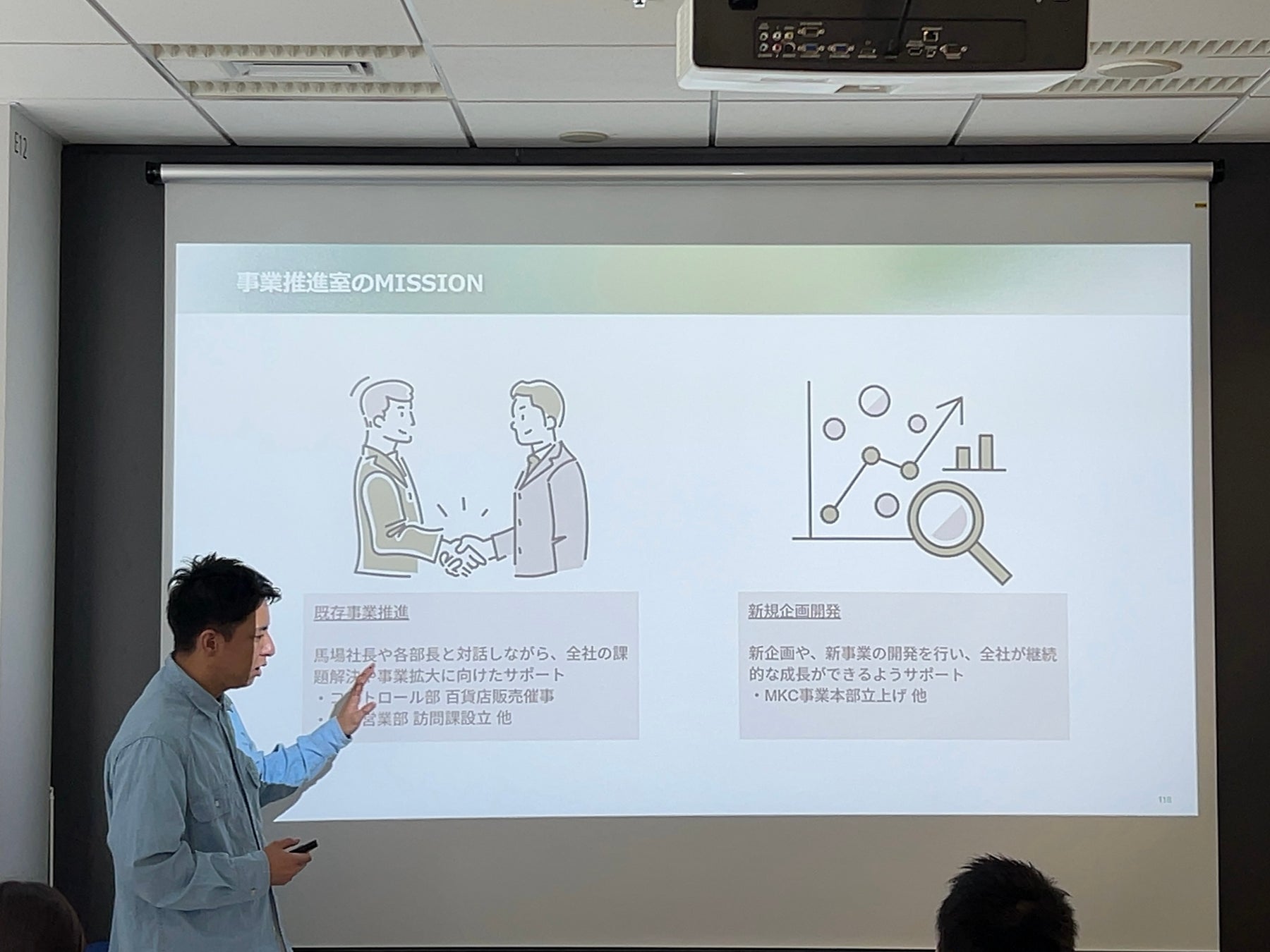 まず、管理部より弊社の生い立ちやMVV、ブランドプロミス「想いに寄り添うパートナー(以下「想パ」)」などの会社説明をいたしました。その後、豊洲オフィスにて懇親会が行われました。また、部長陣から各部署の概要や各部のMVVに対する想いをご説明し、全社理解をより深めました。