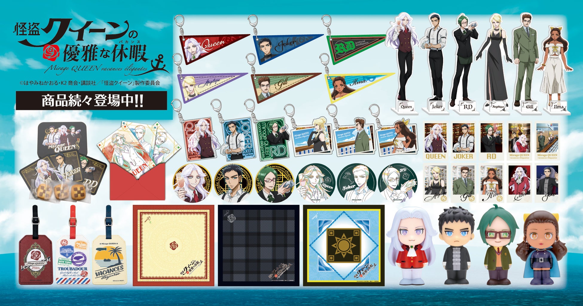 アクリルスタンド、アクリルキーホルダー、TD缶バッジ、TDチェキ風カード、ポストカードセット、クッキー缶にはBARをテーマとしたクイーン、ジョーカー、RDの新規描き下ろし絵を使用。可愛らしくデフォルメされたソフビマスコットはクイーン、ジョーカー、RD、イルマの全4種。作品タイトルの"バカンス"をイメージしたラゲッジタグ、ペナントキーホルダー、スカーフもラインナップしており、どの商品も魅力的なデザインに仕上がっています。