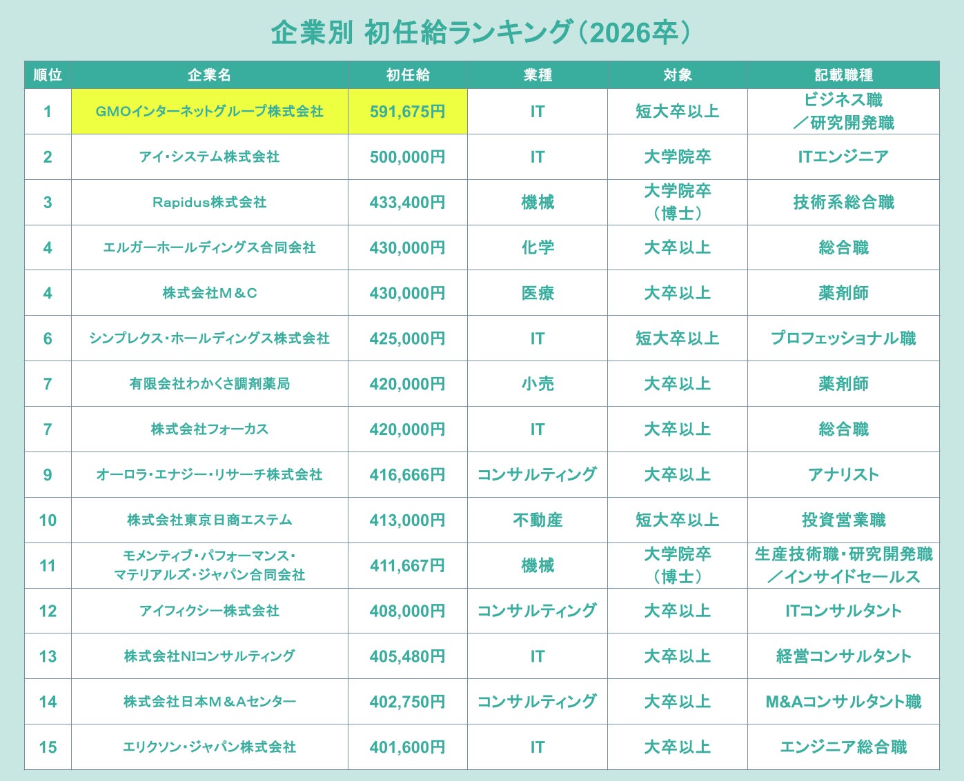 1位の東京都における26卒の初任給を企業別に調査してみると、「GMOインターネットグループ株式会社」が591,675円で最高額となっています。次いで「アイ・システム株式会社」が500,000円、「シンプレクス・ホールディングス株式会社」が425,000円、「オーロラ・エナジー・リサーチ株式会社」が416,666円、「株式会社東京日商エステム」が413,000円と続きました。