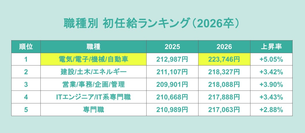さらに、26卒における初任給を職種別のランキングで分析したところ、「電気/電子/機械/自動車」が223,746円で1位となりました。次に「建設/土木/エネルギー」が218,327円、「営業/事務/企画/管理」が218,088円、「ITエンジニア/IT系専門職」が217,888円、「専門職」が217,063円と続いています。