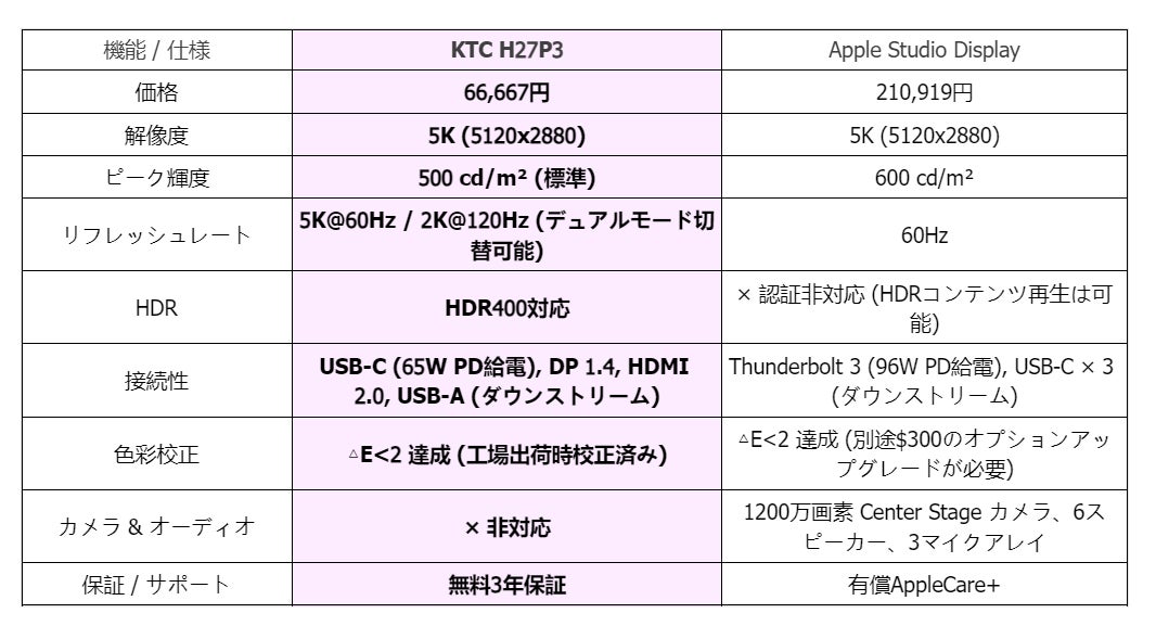KTC H27P3は、「スタジオ品質の表示性能を、より多くのクリエイターやMacユーザーに届けたい」という考えから開発された。Pureな性能比較では一部に差があるStudio Displayに対し、H27P3は「色精度」「柔軟性(刷新率)」「接続性」「価格」において明確な優位性を持つ。内蔵カメラやスピーカーを必要とせず、表示性能そのものにこだわるユーザーにとって、これ以上ないほどコストパフォーマンスに優れた選択肢となるだろう。