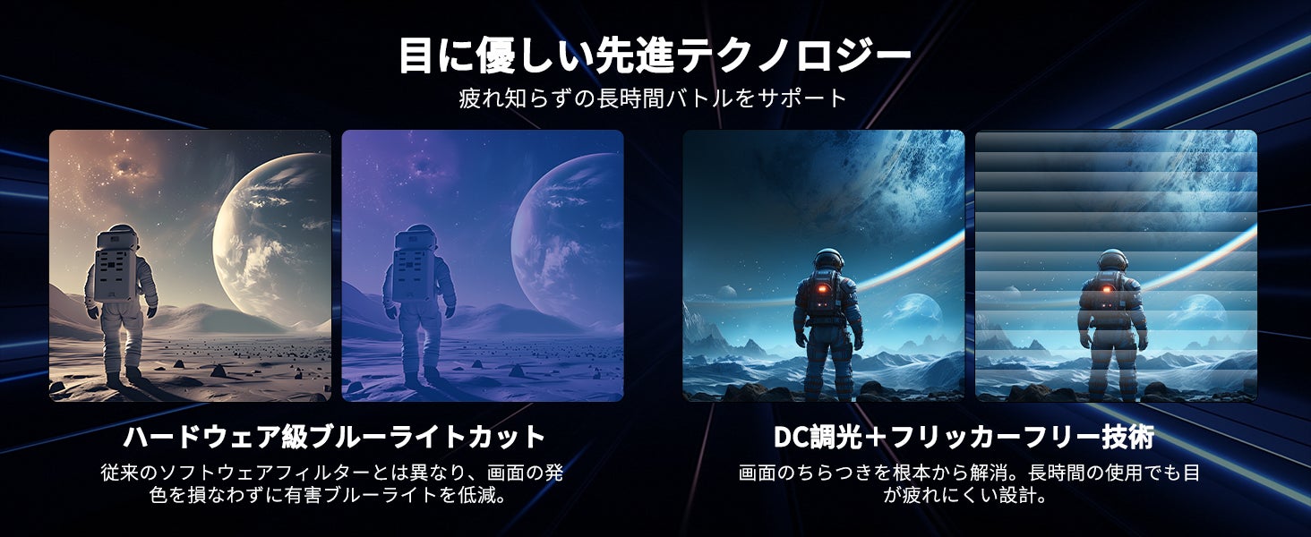 ハードウェアレベルでのブルーライト低減とフリッカーフリー(DC調光) を採用。長時間の作業やコンテンツ鑑賞でも目の疲れを軽減する。スタンドはチルト調整が可能で、VESAマウント(100x100mm)に対応し、ユーザーの好みに合わせた快適な視野角を容易に実現できる。