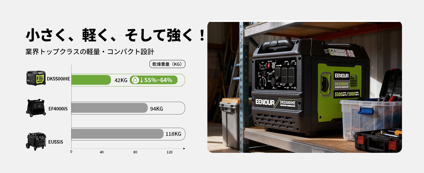 5000W大出力×約42kgの超軽量設計!100V/200V両対応EENOUR インバーター発電機「DK5500iHE」新登場