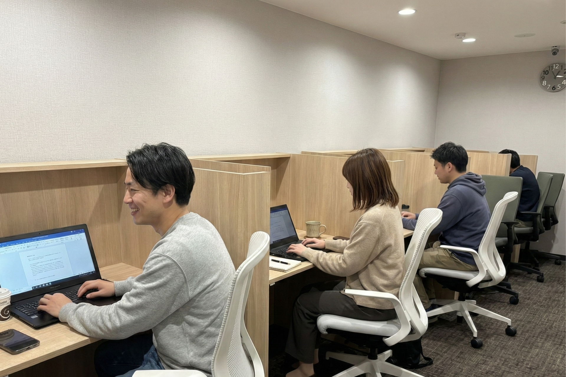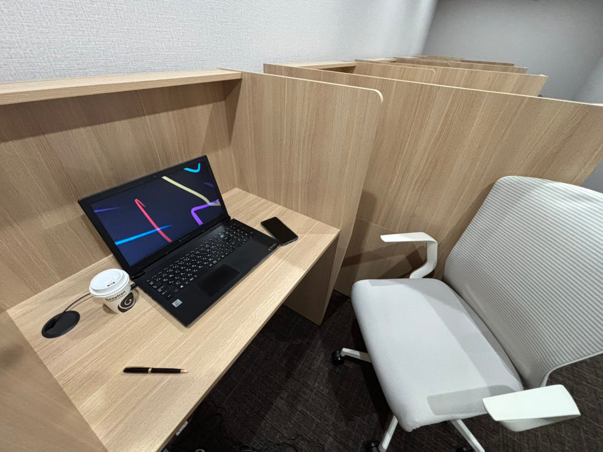 室内には6席の個別ブースを設置。パネルで仕切られたプライベート空間のため、周囲の視線を気にせず作業に集中することができます。また、Wi-Fiと各席に電源を完備しており、長時間の作業でも快適に利用できます。