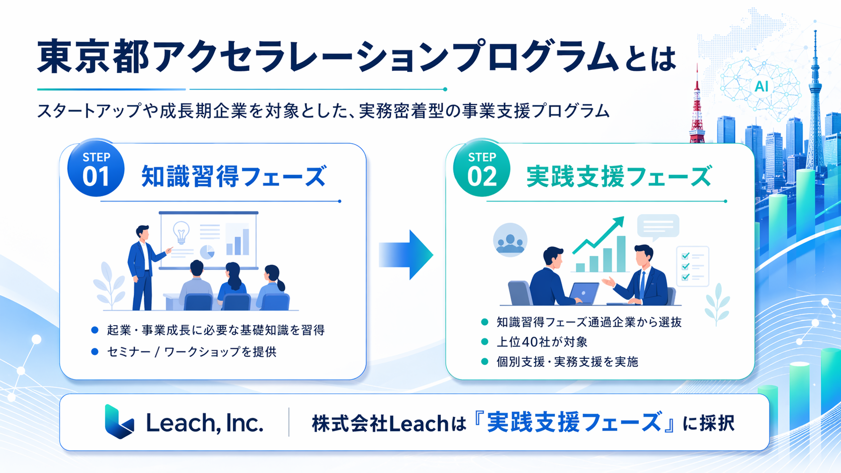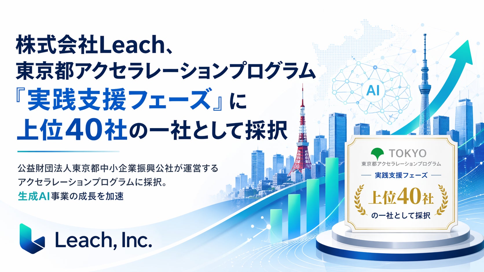株式会社Leach(本社:東京都港区、代表取締役:冨永 拓也)は、公益財団法人東京都中小企業振興公社が運営するアクセラレーションプログラムの「実践支援フェーズ」に、上位40社の一社として採択されました。
