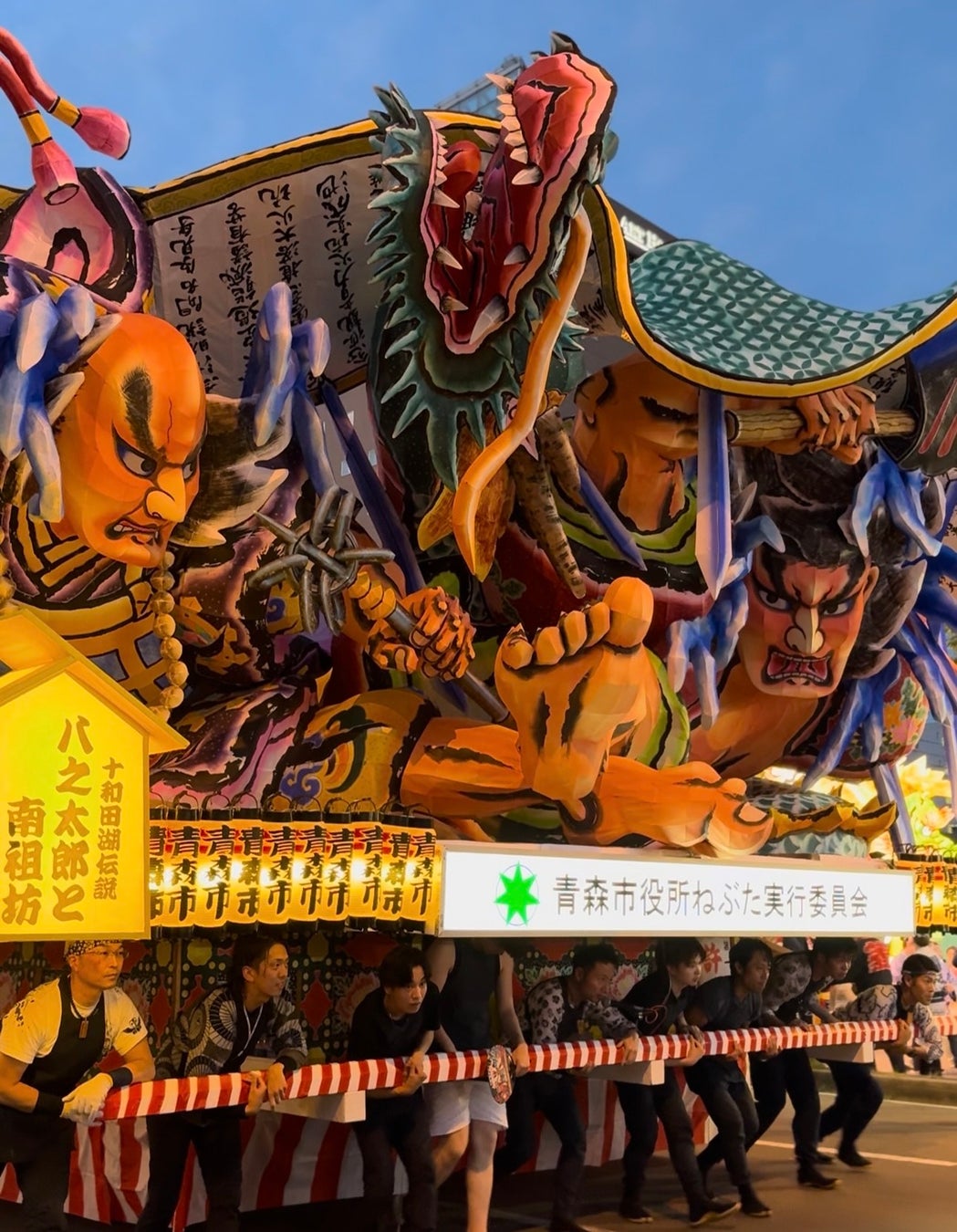 祭の肝となるのはねぶた山車。これはライトアップされる巨大な灯籠で、多くは歴史的事件や歌舞伎の一幕を題材に作られます。祭りの参加者は3キロの行列ルートに沿ってねぶたを押し、地元の人や日本中から集まった観光客は道沿いに座ってその行列を眺めます。行列では跳人と呼ばれる踊り手が「ラッセーラー」のかけ声と共に踊りを披露し、行列を応援するとともに観客を盛り上げます。お囃子衆の太鼓が奏でる低音はねぶた行列のルート上に響き渡り、観客は屋台で祭の味を楽しみます。