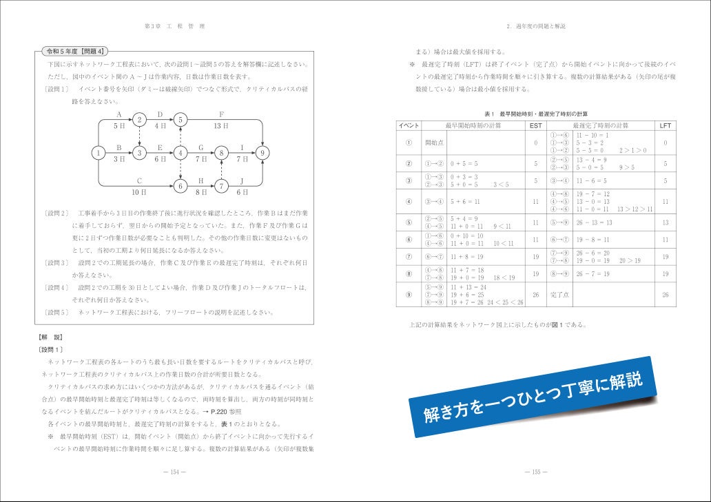 従来は「工程管理」と「法規」のどちらかを選択して回答すればよかったのですが、令和6年度試験からは両方必須問題となりました。「工程管理」分野では、毎年ネットワーク工程表が出題されています。本書では、その解き方を丁寧に解説しています。特に令和6年度問題の解説では、複数の解法を紹介していますので、自分に合った解き方を見つけることができます。