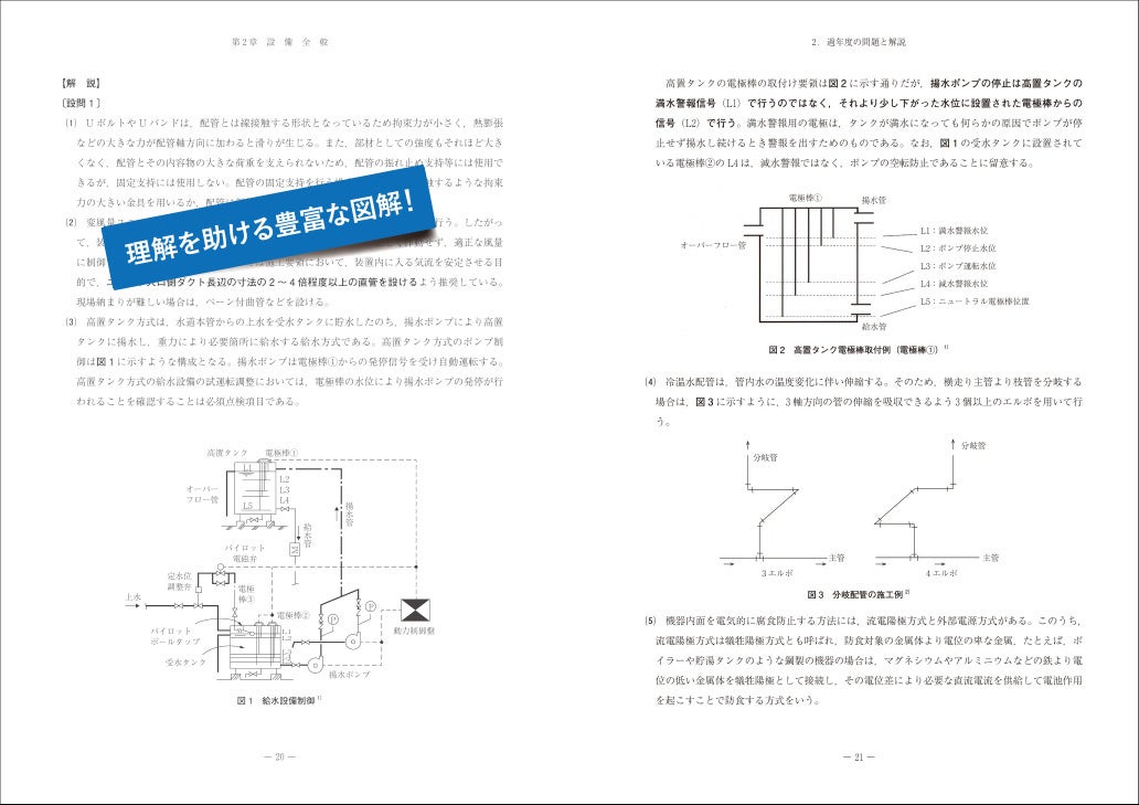 従来の1級管工事施工管理技術検定 第二次検定は、「設備全般」「工程管理(ネットワーク工程表)」「法規」「施工経験記述」の4分野で構成されていました。令和6年度から受検資格の見直しとともに、試験内容についても見直しが行われ、必須問題であった「施工経験記述」がなくなり、同じ要素が「設備全般」の設問に組み込まれました。「設備全般」分野では、各種施工要領図等の判読や各種機械設備の施工上、試運転時等における留意事項や技術的事項が問われますが、本書では、それらを図表と併せて丁寧に解説しています。
