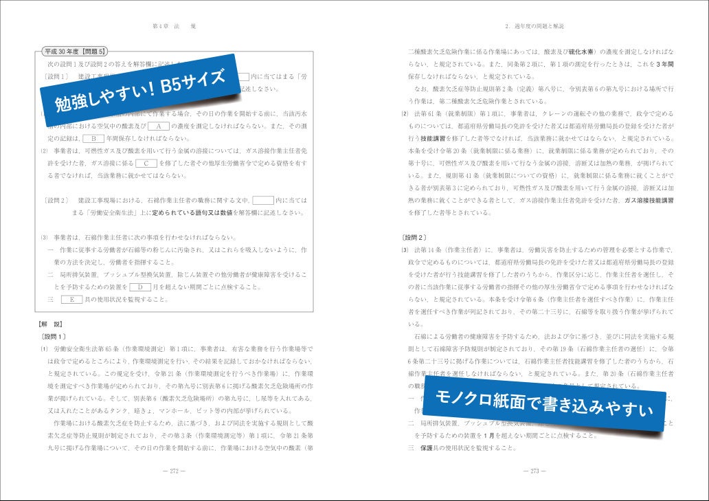 「法規」分野では、労働安全衛生法に関する問題が出ます。書き込みしやすいモノクロ紙面なので、間違えた部分をチェックしたり、マーカーを引くなど、自分が覚えやすいようにカスタマイズできます。