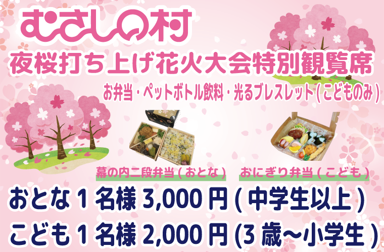 【遊園地むさしの村】遊園地で夜桜×打ち上げ花火!「夜桜打ち上げ花火大会」3月28日(土)開催!(雨天・強風予備日3/29(日))