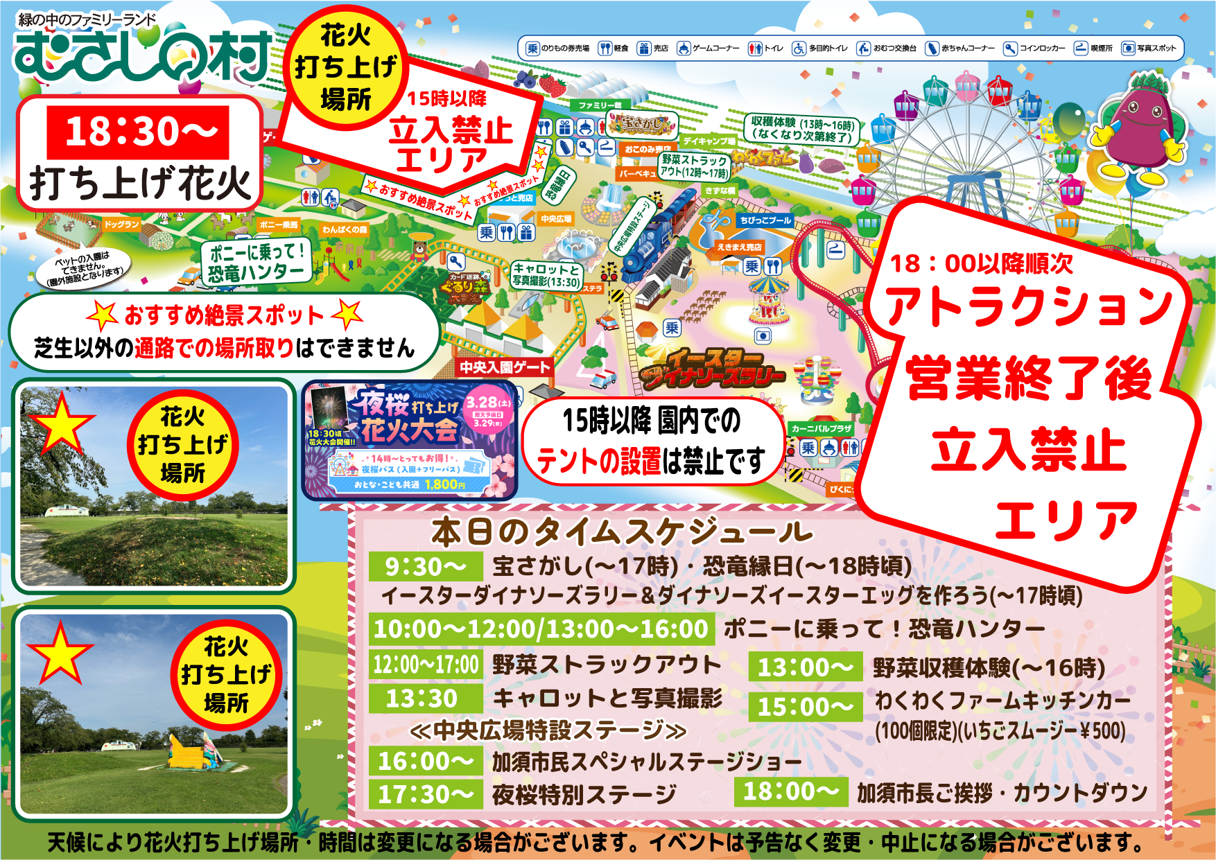 緑の中のファミリーランドむさしの村(所在地:埼玉県加須市、代表取締役社長:榎本和行)は、2026年3月28日(土)に夜桜打ち上げ花火大会を開催いたします。(雨天・強風予備日:3/29(日))