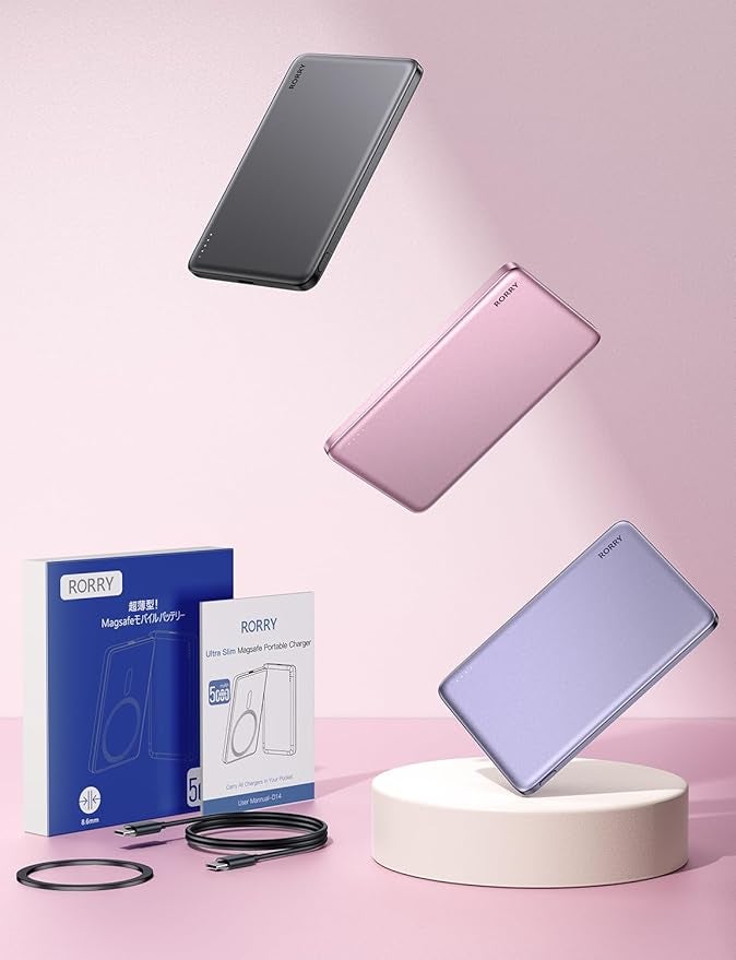 世界最薄クラスのMagSafe対応モバイルバッテリー「D14」は、厚さわずか8.6mm、重さ約110gというスリムかつ軽量なボディで、日常持ち歩きに最適です。ポケットに入れてもかさばらず、スマホと重ね持ちしても違和感のないコンパクト設計。