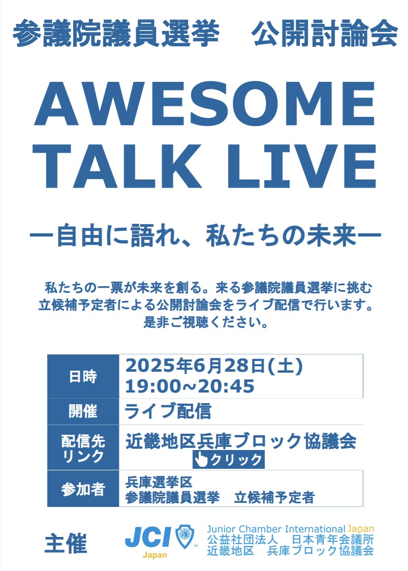 本事業では、「参議院議員選挙 公開討論会 AWESOME TALK LIVE!~自由に語れ、私たちの未来~」と題して、これまで政治への関心が薄かった層にも、国政を「自分ごと」として捉え、政治参加への意識を高めていただけるような機会として、参議院議員選挙立候補予定者による公開討論会を下記のとおり開催し、あわせてYouTube によるライブ配信も行う運びとなりました。