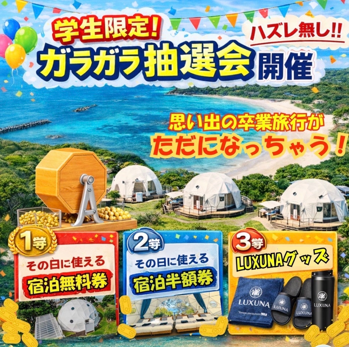 学生最後の夜は、LUXUNA伊勢志摩で。トゥクトゥク・亜熱帯サウナ・運試しの抽選会まで盛りだくさん!