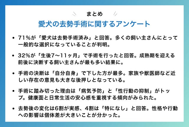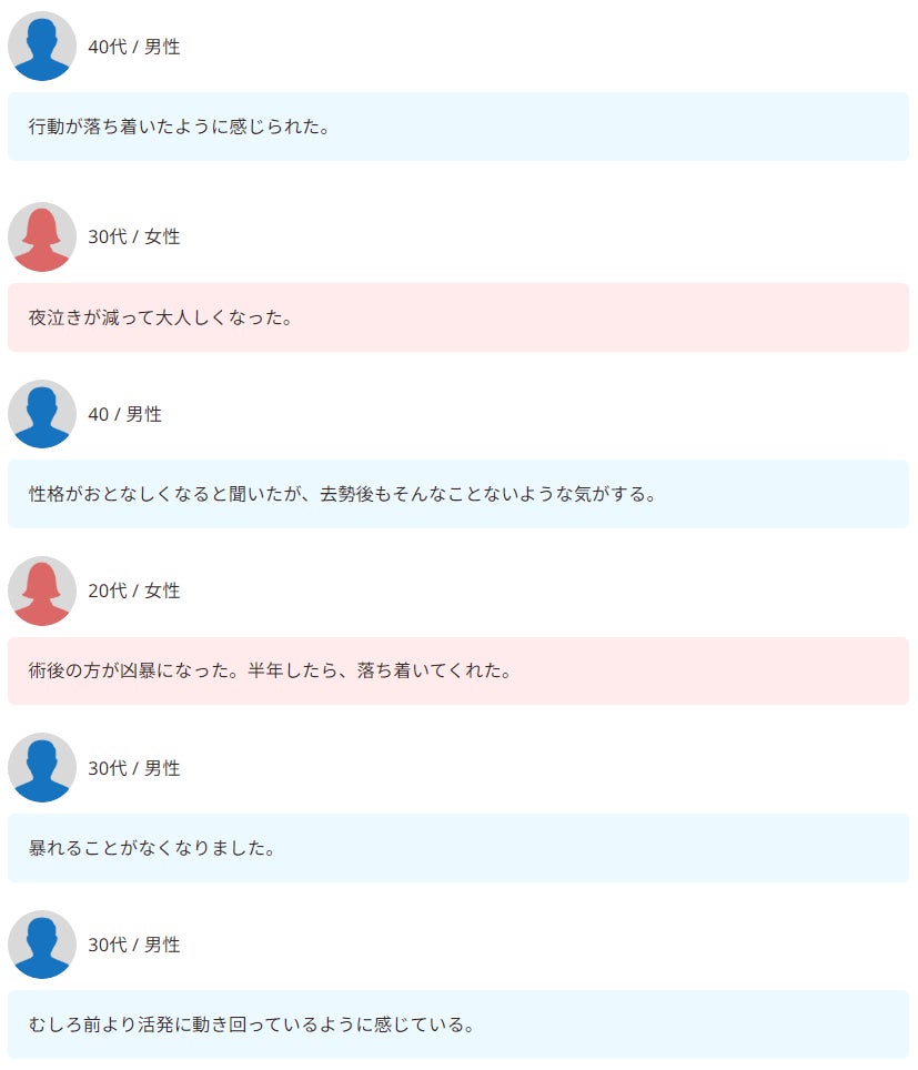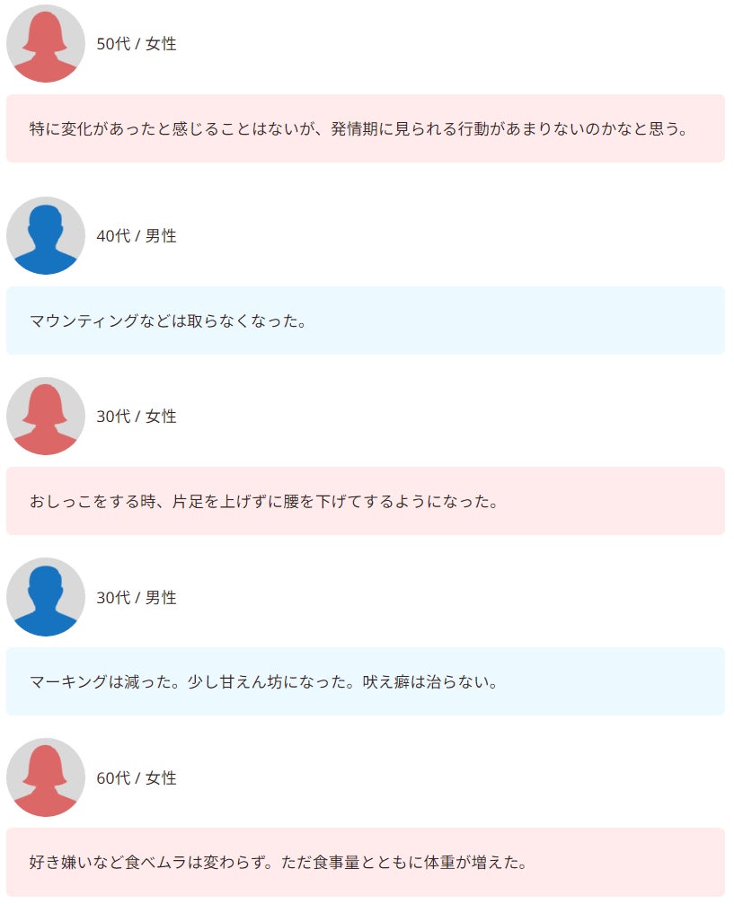 一方で4割は「特に変化なし」と回答。「性格が大人しくなると聞いていたが、実際はそうでもなかった」といった意見も寄せられ、必ずしも手術によって性格や行動が変わるわけではないことが分かりました。