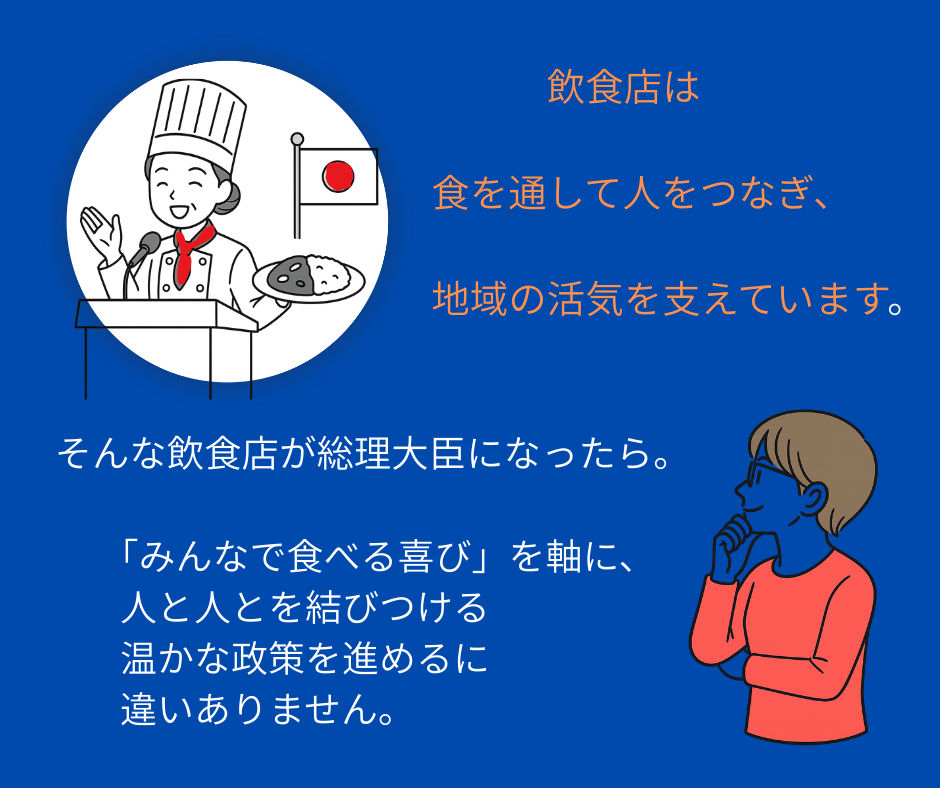 食を通じて人を笑顔にする飲食店主が、もしも日本の総理に?地域の声を直接聞く立場から国を考える『飲食店総理』が妄想総理シリーズ職業編第5弾として登場しました。