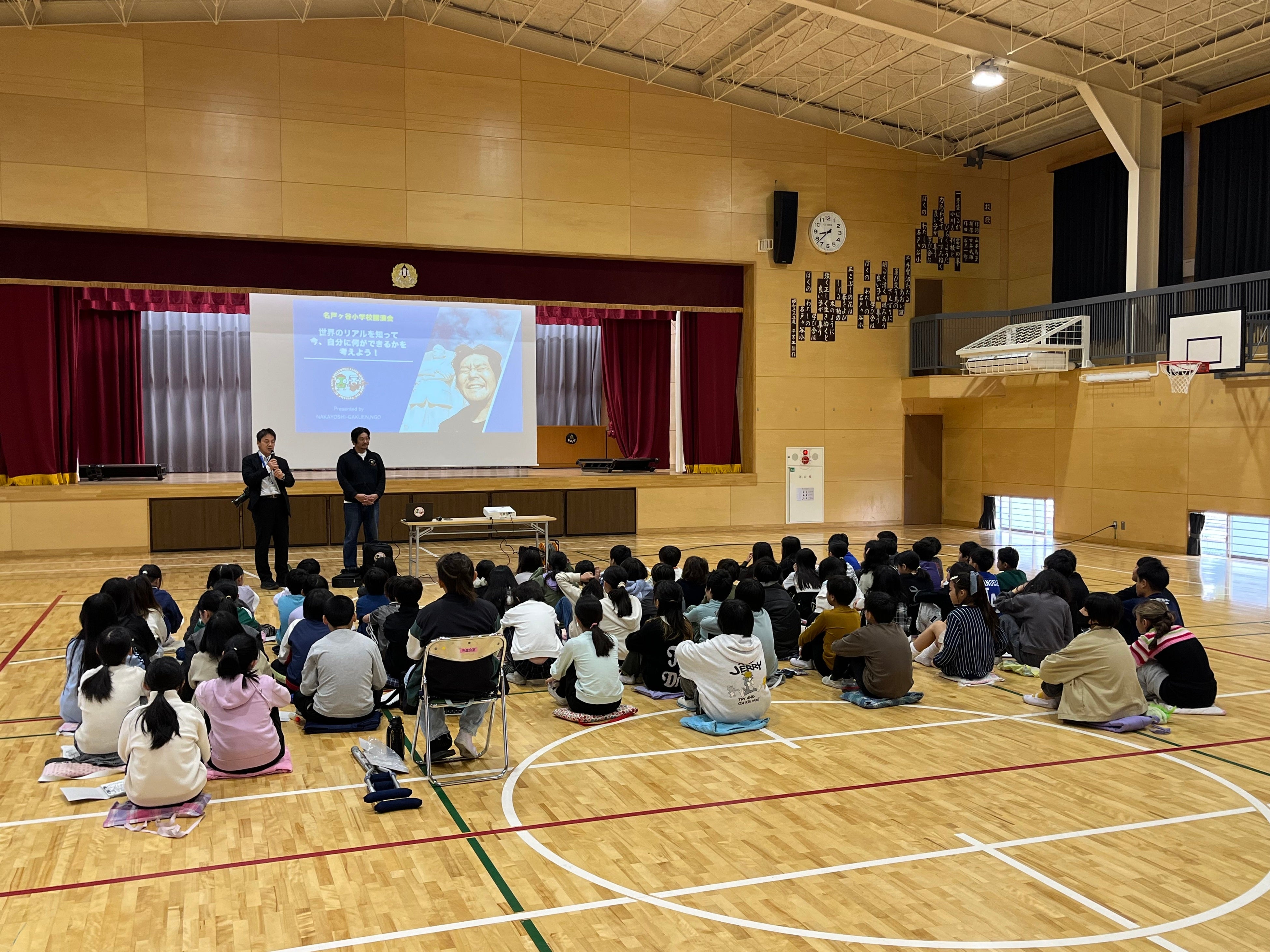 今回の講演は5年生を対象に行われ、児童たちは自分たちが育てた餅米が、どの国へ、どんな状況の子どもたちに届くのかという“その後のストーリー”を聞きました。