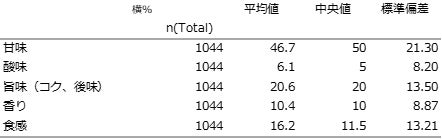 例)甘味40%、酸味5%、旨味15%、香り15%、食感25%
