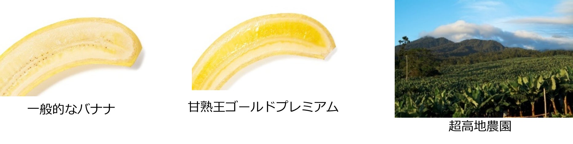 このように、フルーツにおいて「甘さ」という価値を重視する日本人の嗜好に応えるため、2006年6月には、スタンダードな「高地栽培バナナ」よりも 約1ヶ月長く生育にかかる標高800m以上の“超高地農園”での栽培も開始。さらに2014年5月には「甘さ」だけでなく、美味しさの黄金バランスを追求し、肥沃な土壌のみを限定した「ゴールドエリア」で、畑ごとに詳細な土壌分析を実施し、マグネシウム・チッソ・リン酸・カリウムなどのミネラルバランスを整え、有機質肥料を中心に施肥しながら、健康的な土壌を保つ、「ミネラル栽培」を実践。これにより、まるで蜜が入っているかのような黄金色の果肉、甘熟王を超える“もっちり、濃蜜な甘さ”を実現した、さらに上をいく美味しさの超高地ミネラル栽培バナナ「甘熟王ゴールドプレミアム」が誕生しました。※美味しさへの挑戦とこだわりをわかりやすく伝えるべく、パッケージデザインを5月初旬よりリニューアルします。